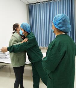 在治疗过程中,一位护师给患者采血不小心划破了自己的手指,到医生办公室王彩荣主任为受伤护师查看伤情并消毒,还给她了一个深深的拥抱。
