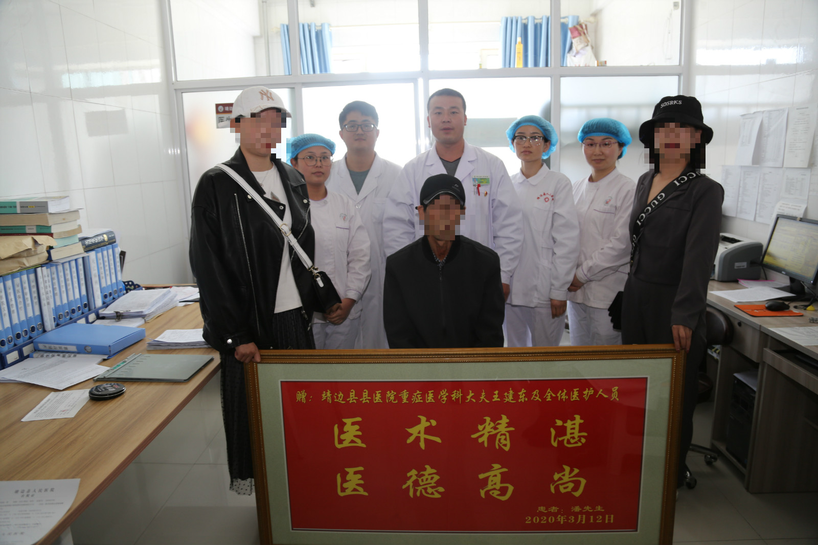患者及其家属为感谢重症医学科主管医师王建东及全体医护人员,2020年3月16日,特意送来牌匾表示感谢。患者家属说:感谢您们这么多天来的精心治疗和细心照顾。