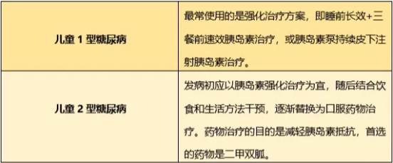 胰岛素注射治疗是儿童1型糖尿病目前唯一有效的治疗方法。儿童2型糖尿病患者发病初应仍以胰岛素强化治疗为宜,随后结合饮食和生活方式干预,逐渐替换为口服药物治疗。