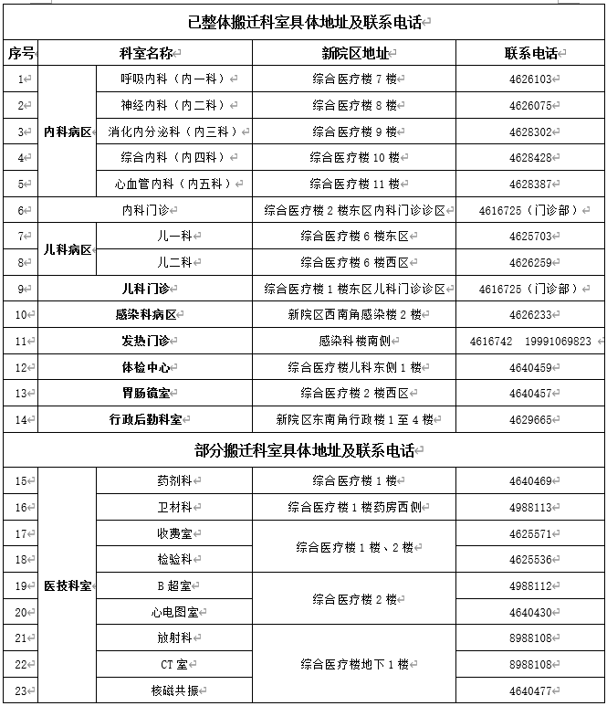 我院已整体搬迁至新院区的科室有:内科住院病区、内科门诊、儿科病区、儿科门诊、感染科、发热门诊、体检中心、胃肠镜室、核磁共振室及行政后勤科室。有需要就诊的患者或办理业务的人员,请到新院区(靖边县新区康复路1号)进行就诊、咨询或办理。