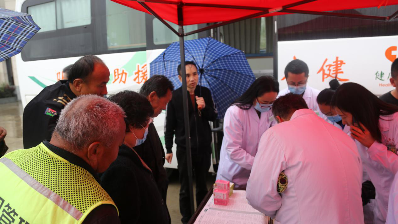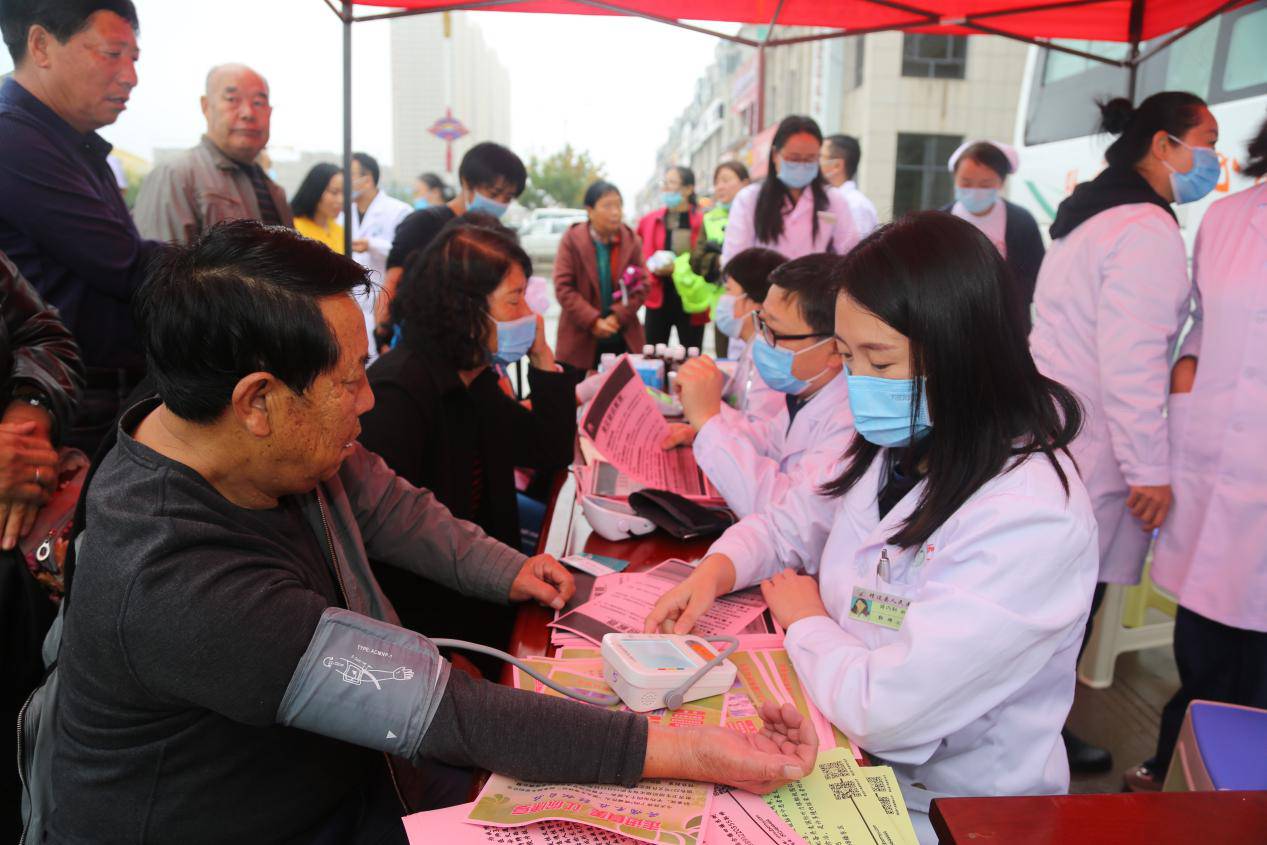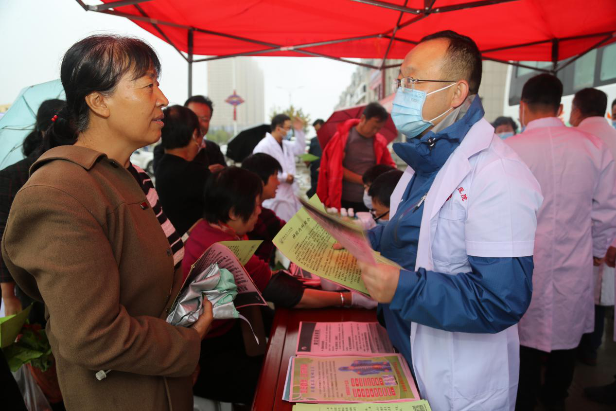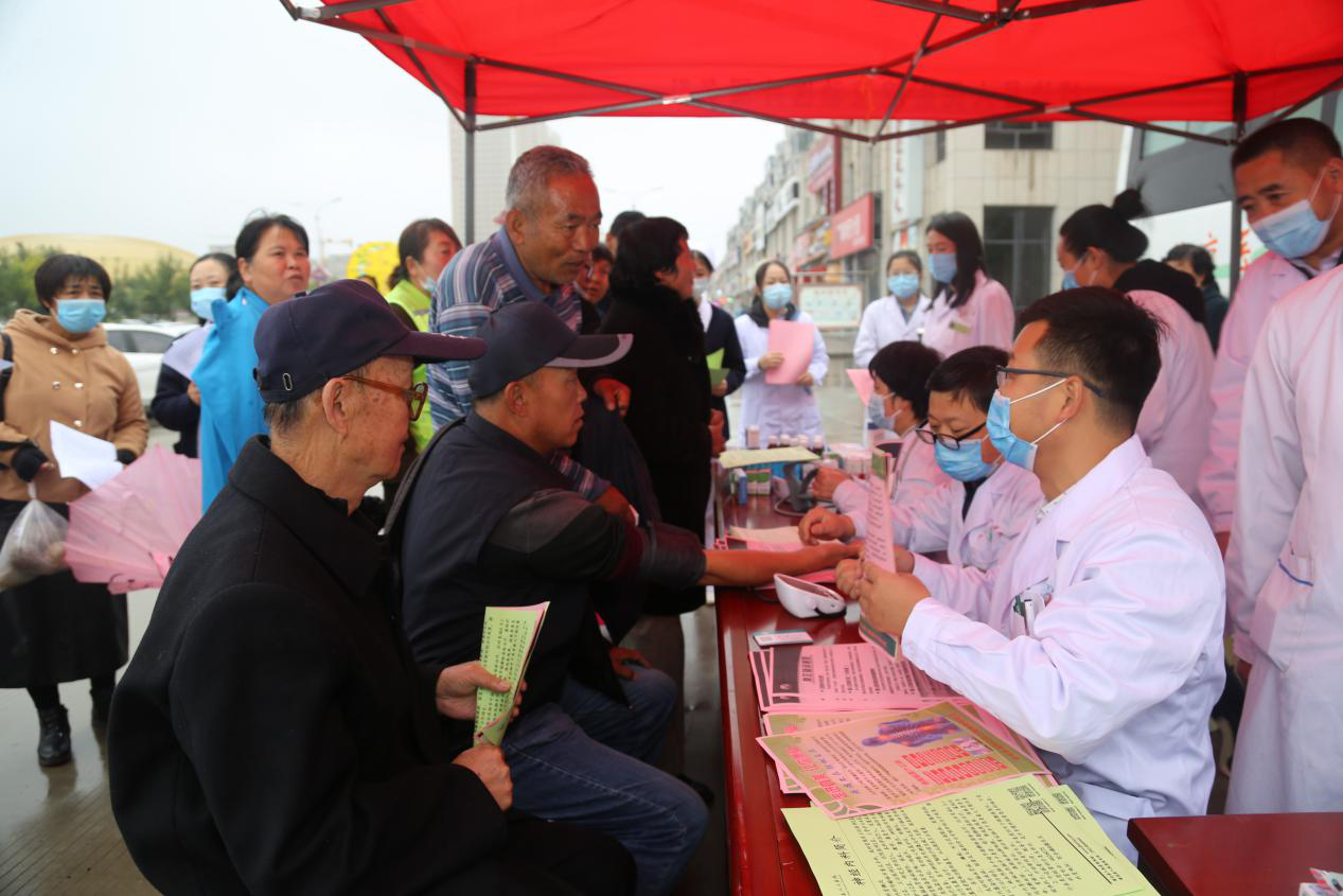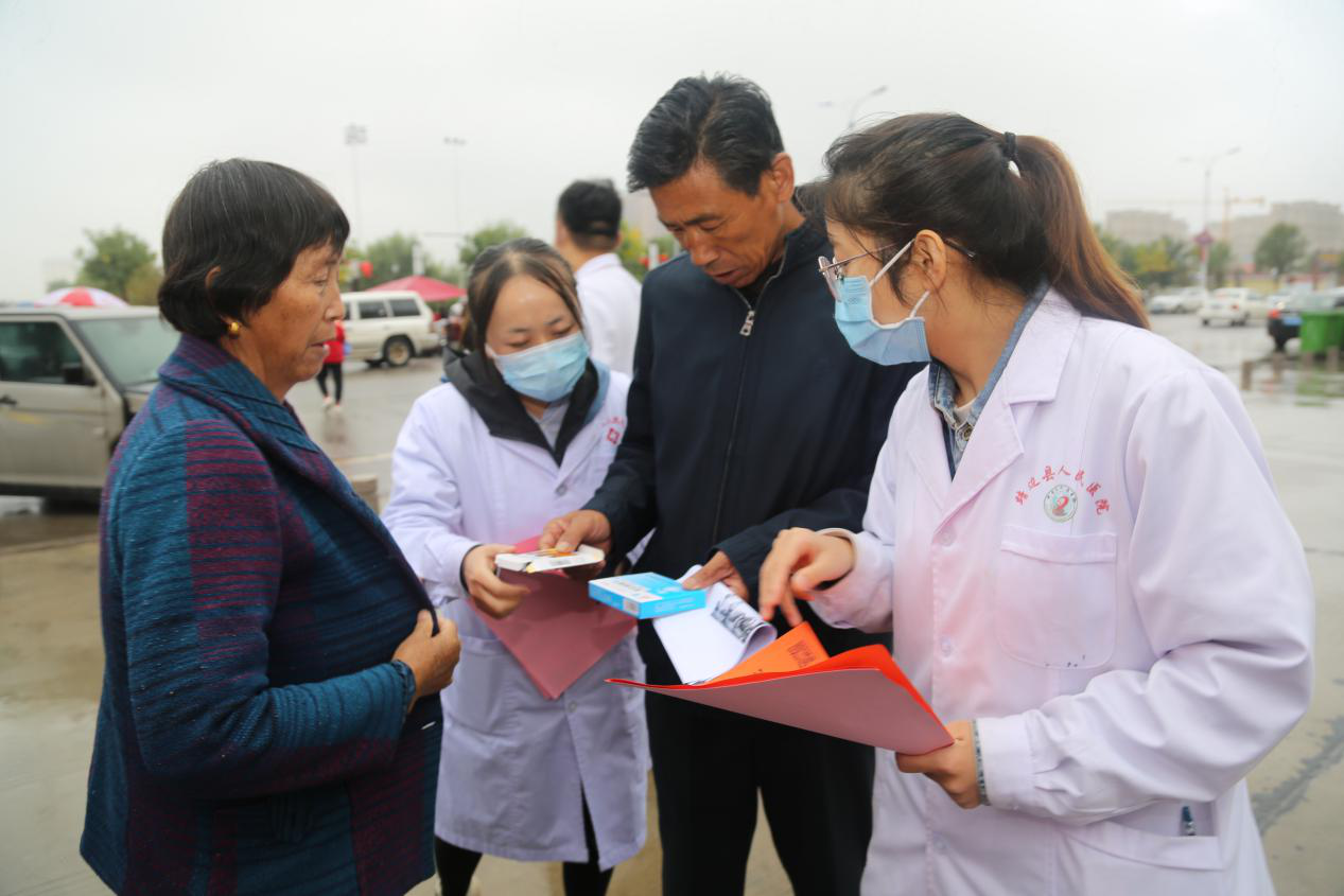 义诊现场,前来的患者根据自身情况和病情找到医生进行诊治,医生结合患者的身体状况提出相应的医疗指导和建议,药剂科根据医嘱为患者免费发放相关药物。同时,医务人员免费为患者测量血糖、血压,并为群众发放健康教育宣传单,普及医学常识和健康知识,倡导科学、合理的生活方式。