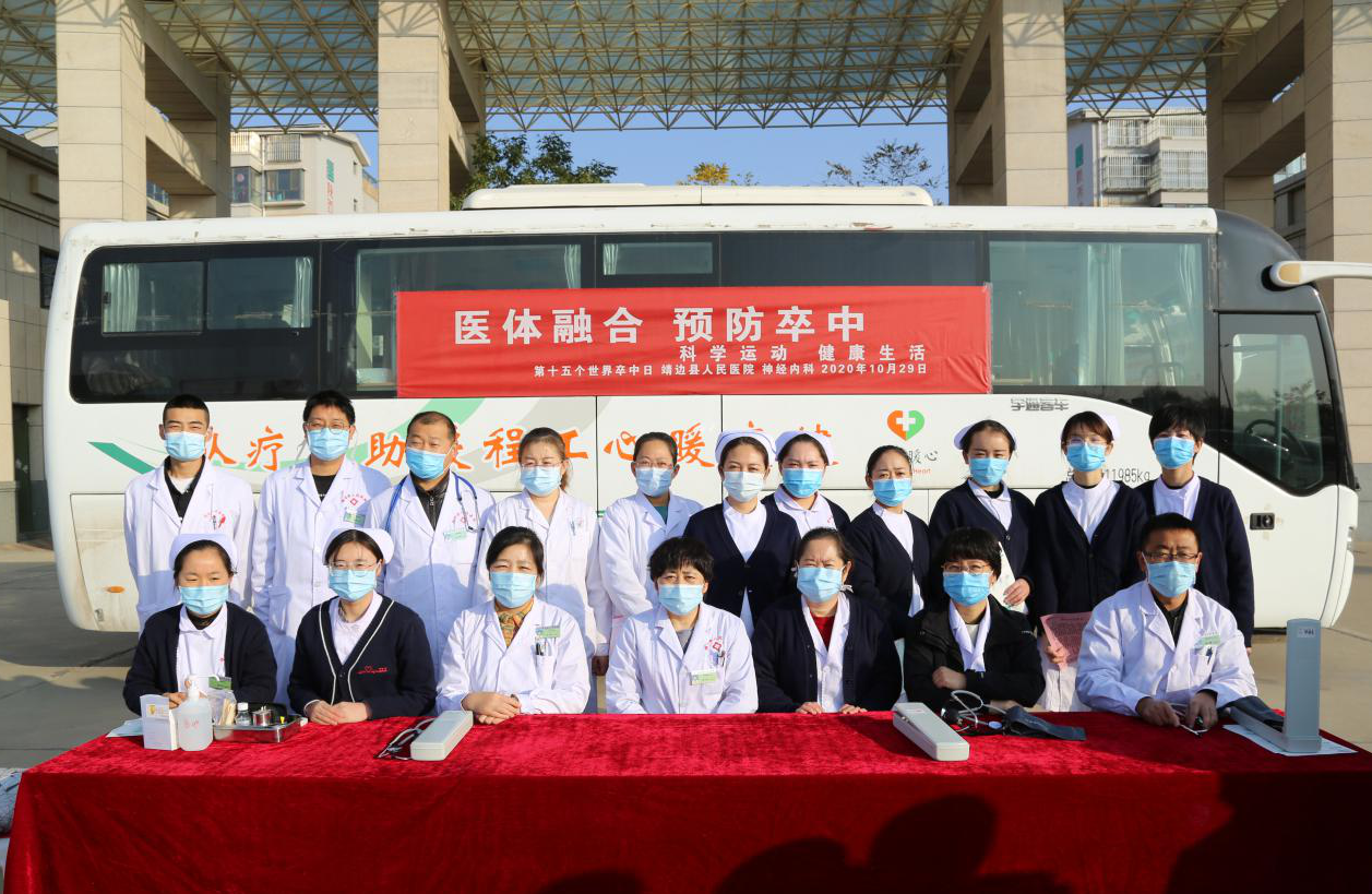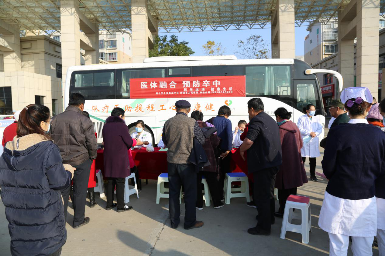 2020年10月29日,是第15个世界卒中日,为了提高广大群众对脑卒中的认识,普及脑卒中科普知识,以提高健康生活质量,实现脑卒中,早防、早诊、早治。我院神经内科于2020年10月29日一早在阳光家园南门开展主题为“医体融合,预防卒中”大型义诊活动。