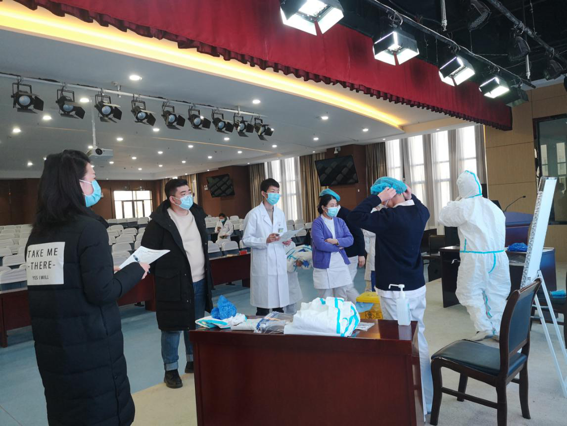 图为:医疗队三位专家对我们医护人员进行穿脱防护服集中培训