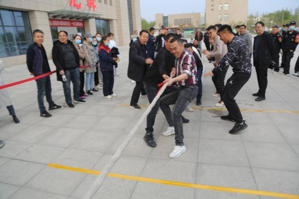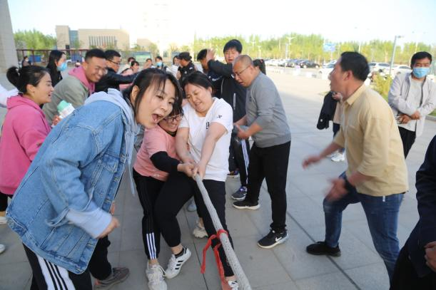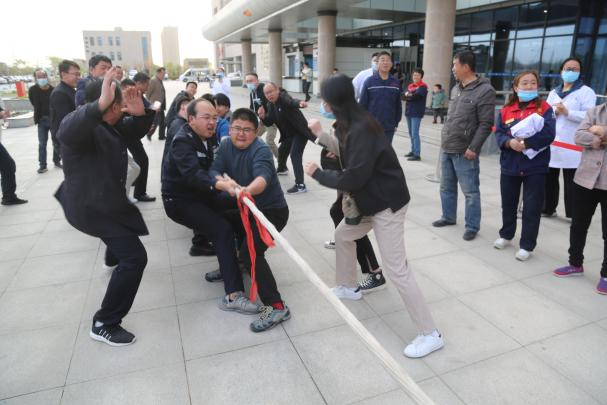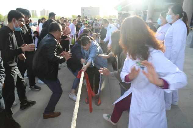 首场比赛是男子、女子拔河,在儿科门诊门前举行,每队共由10人组成。参赛的队员专注的紧握绳子,随着裁判一声哨响,比赛正式拉开序幕。队员们个个斗志昂扬,紧握长绳,卯足劲,拼命往后拉。现场观众个个热情高涨,纷纷在旁加油助威,呐喊声、鼓掌声、欢笑声此起彼伏,精彩纷呈,赛场已然是一片欢乐的海洋。