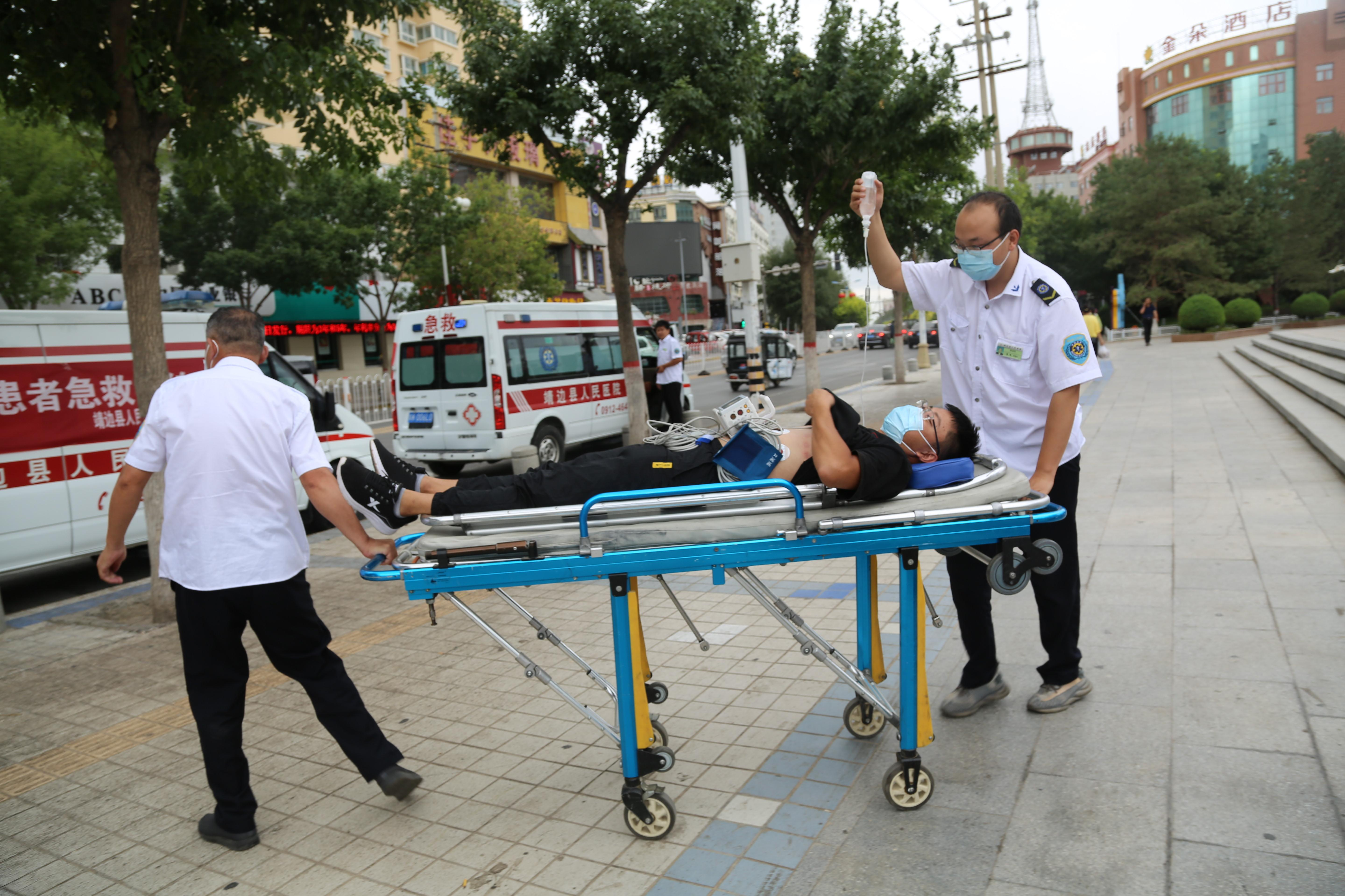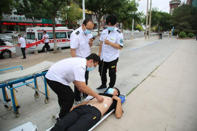 上午九点,演练正式开始。此次演练模拟一位突发急性胸痛患者拨打本院急救电话求救场景。急救站接急救电话后询问患者症状及所在位置和身边人员情况,做出初步判断后,嘱咐患者静稳等候,保持电话畅通,随即发出出诊指令。院前急救当班医生、护士和急救车司机跑步就位,启动车辆,鸣笛出发,立即驶离医院大门。出诊人员按照急性胸痛患者院前急救流程拨通患者电话,指导患者自救。