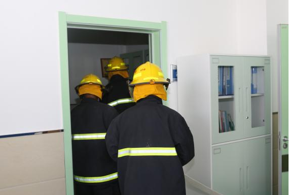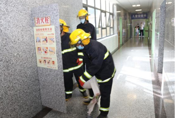 此次演练模拟儿科门诊办公室失火,科室人员发现失火后,立即启动火灾应急疏散预案,第一时间打电话报警,科室立即组织开展初期火灾自救,护士长及时向分管领导汇报。消防人员赶到现场后,协助儿科门诊医护人员对就诊人员进行疏散,同时进行灭火。