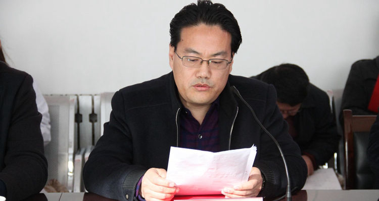 图为:人事科科长袁海军作《关于表彰奖励2015年度先进科室及先进个人的决定》