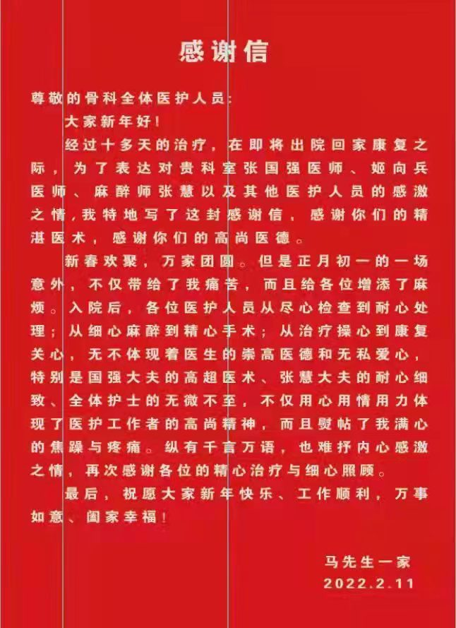 我院骨科收到一封来自患者的感谢信