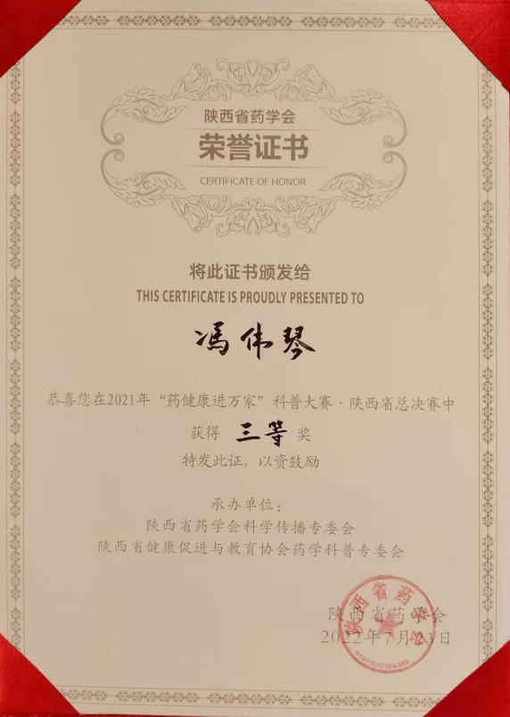 7月23日上午,由中国药师协会和陕西省药学会主办的“药健康进万家”科普大赛陕西省总决赛在西安举行。我院临床药学科冯伟琴在此次比赛中喜获三等奖,并入选了全国药健康科普人才储备库。