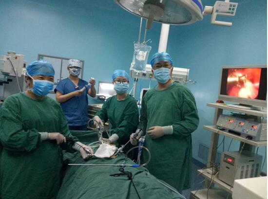 图为:苏州大学附属第二医院妇产科陈昕主任与我院妇一科宋颖主任做经腹腔镜下右侧输卵管切除手术