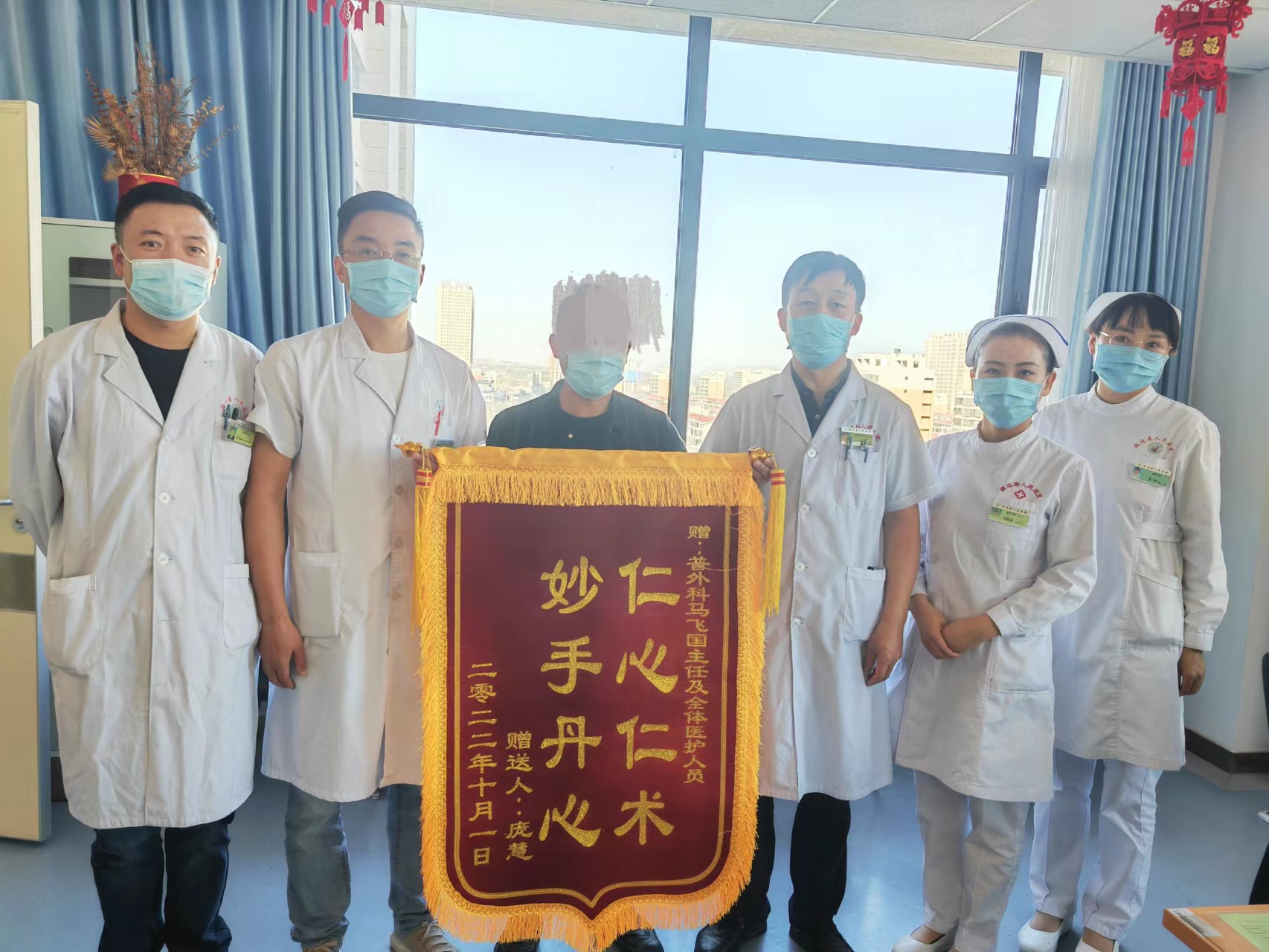 在医护人员的精心呵护下,患者恢复良好,逐步恢复饮食,各项化验指标渐恢复正常,无术后并发症出现,10月8人痊愈出院。出院时患者家属我院普外科的医护人员送来锦旗表示感谢,并对我院普外科的医疗技术和护理工作给予了肯定和赞誉。