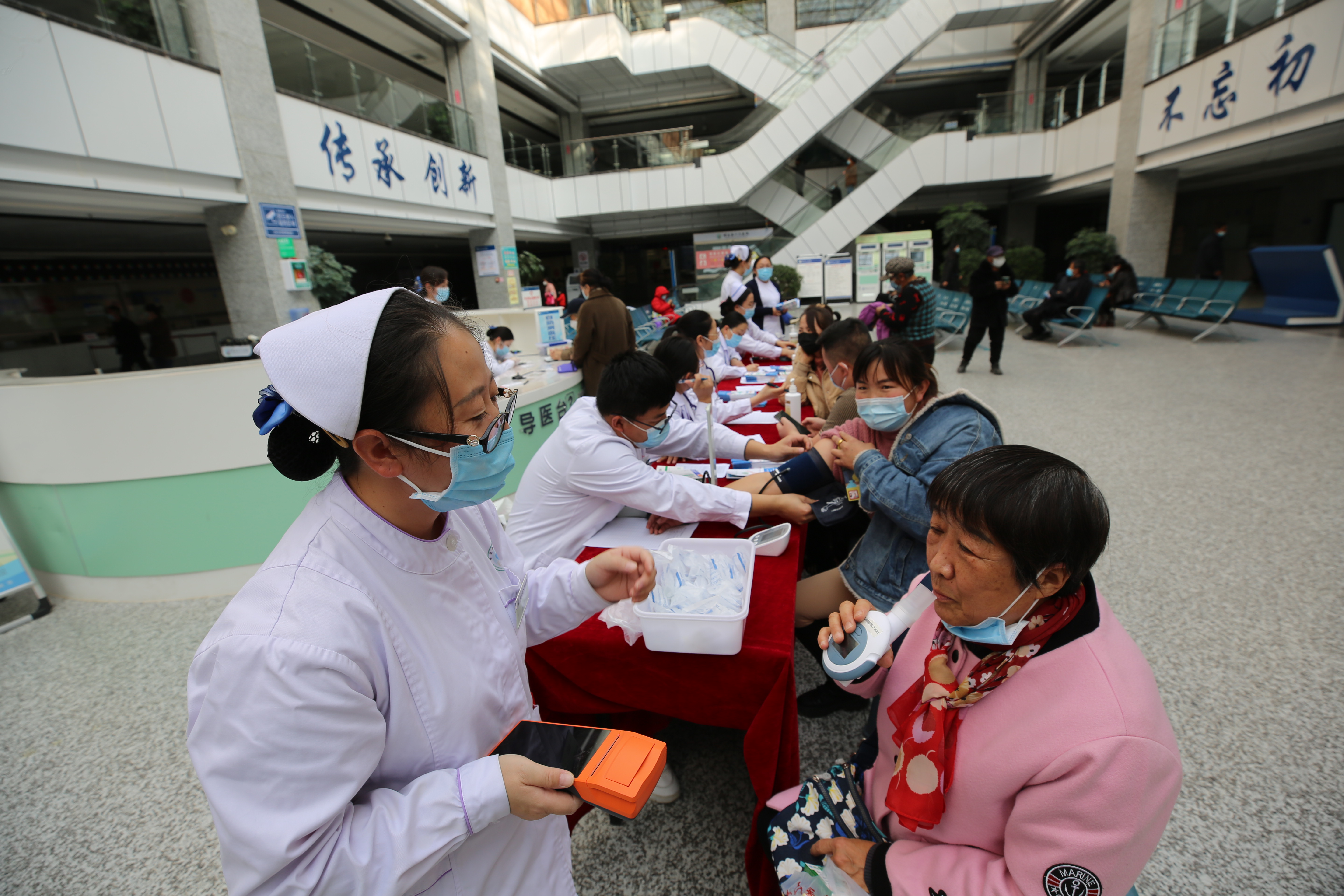 医务人员耐心解答群众疑问,详细询问病情,开展饮食及药物指导,制定糖尿病防治方案,指导监测血糖的时机及胰岛素规范注射的方法等一系列糖尿病知识宣教活动。对初筛的异常患者给出详细的诊治方案。