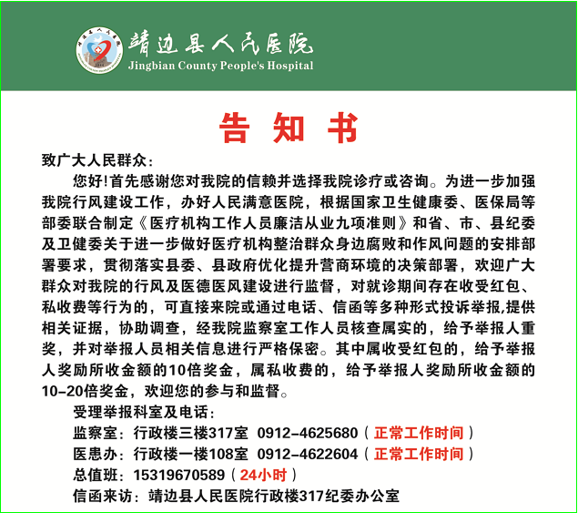 2021年1月6日,为进一步加强我院行风建设工作,提高人民群众就医获得感,按照中、省、市、县有关行风建设要求,结合医院实际情况,我院通过医院网站、微信、视频号、公示牌等多种途径,向社会公开发布有奖举报公告,欢迎广大人民群众对我院的行风及医德医风建设进行监督。