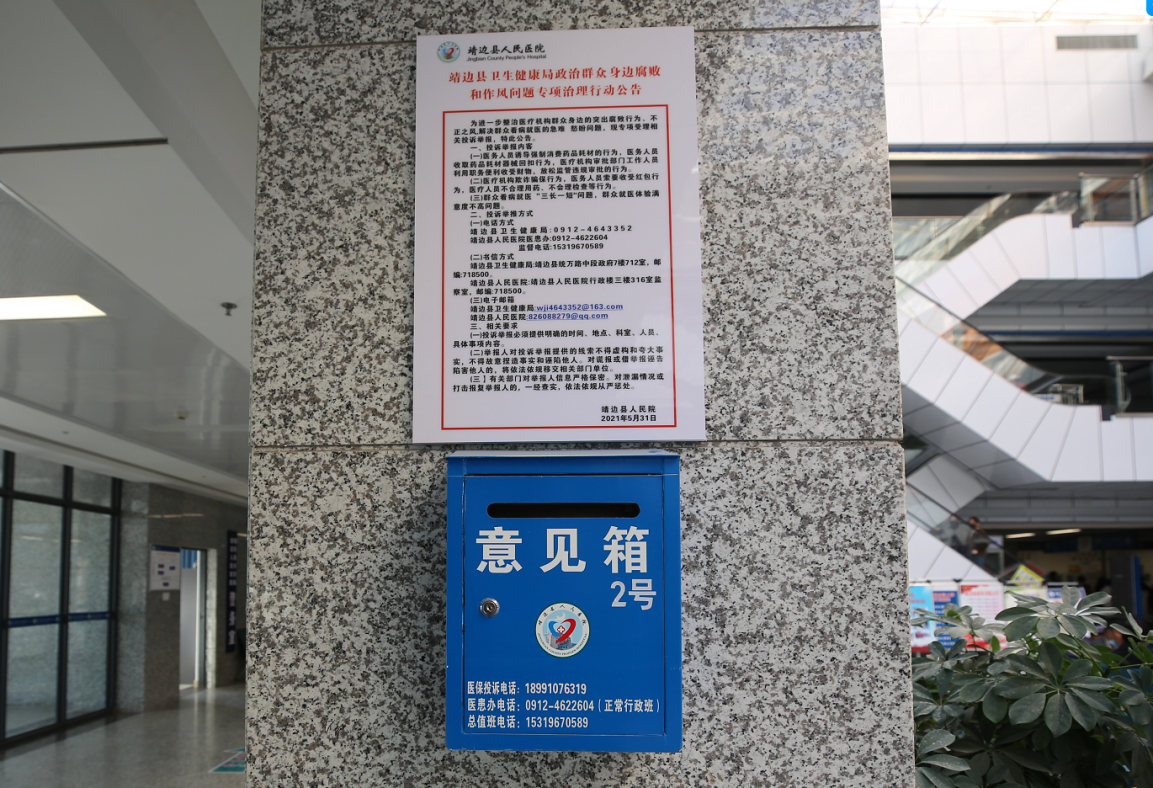 我院在行政楼一楼大厅、门诊大厅设立举报意见箱和整治群众身边腐败问题和作风问题专项治理行动公告牌,向广大人民群众公布投诉举报地址、电话和邮箱;同时在医院网站、微信订阅号公布总值班电话,解决了我院举报线索收集渠道单一的问题,主动接受社会各界的监督。