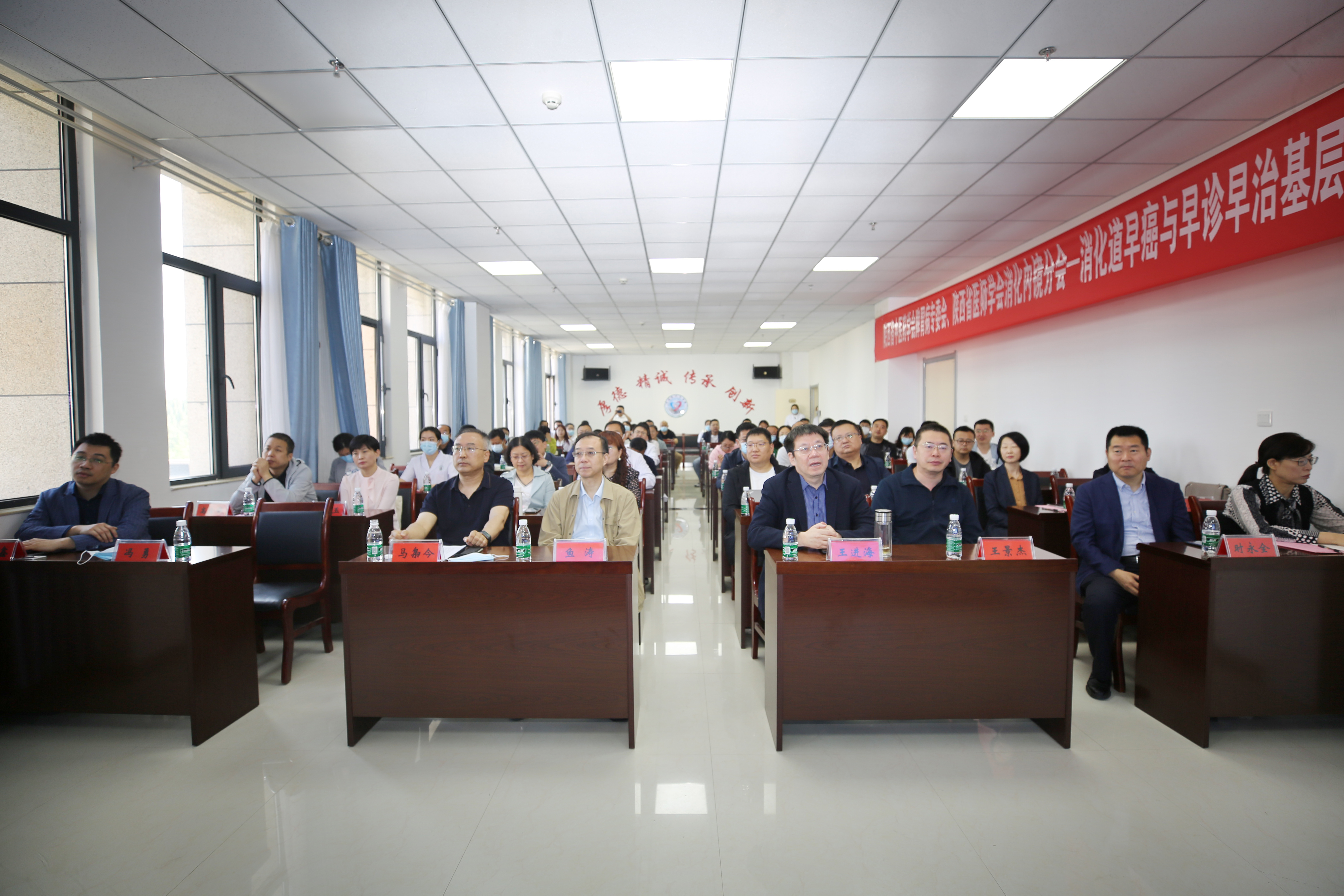 陕西省中医药学会脾胃病专业委员会主任委员、陕西省中医院脾胃病科主任鱼涛教授,西安交通大学第二附属医院消化科主任王进海,唐都医院消化内科王景杰教授,西京医院消化内科副主任时永全,西安医学院第一附属医院消化内科主任张明鑫,西安医学院第二附属医院消化内科主任陈建婷,陕西省第二人民医院业务副院长陈张琴,陕西省第四人民医院消化内科主任武彦芳,西安市第三医院消化内科副主任张超,西安市第五医院消化呼吸科主任左利平,西安市第九医院消化科主任王鑫,以及市域内各兄弟单位消化界同仁参加会议。我院党委书记、院长马枭今、副院长姬向兵、冯勇及其他相关院领导、科室负责人和医务人员参加会议,冯勇主持会议。