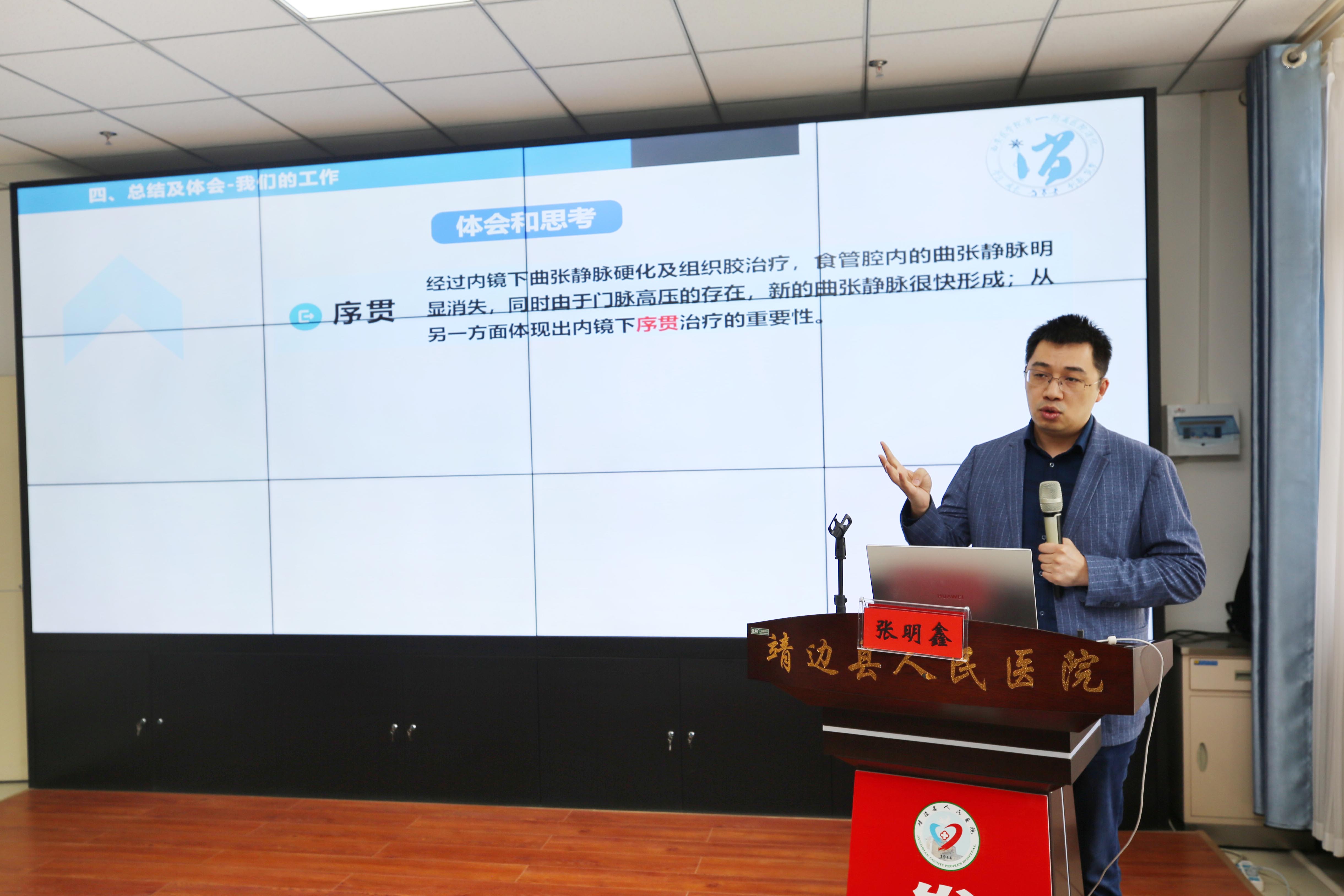 图为:西安医学院第一附属医院消化内科主任、主任医师张明鑫作《食管静脉曲张硬化治疗的实践与思考》讲座