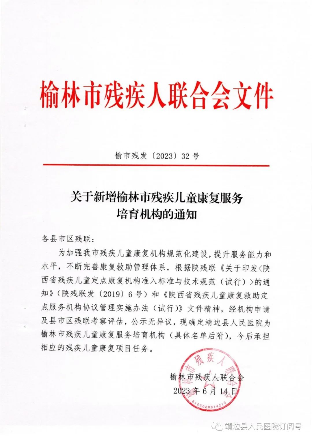 近日,榆林市残疾人联合会,公布了2023年度榆林市残疾儿童定点康复机构名单,我院被列入