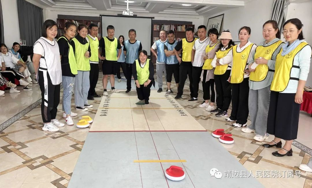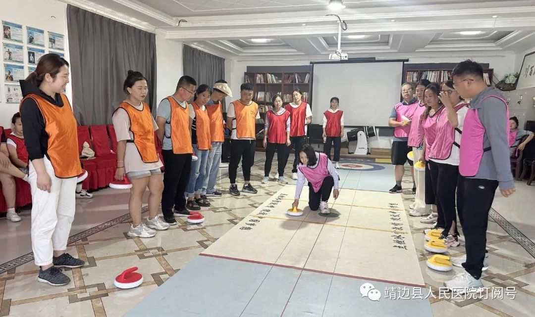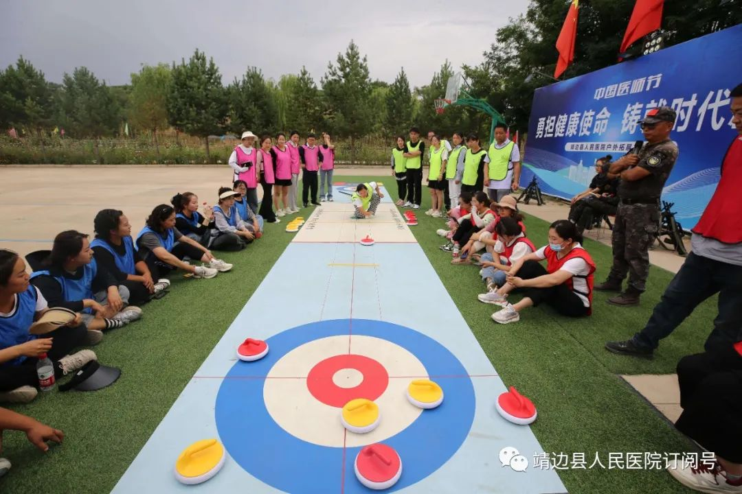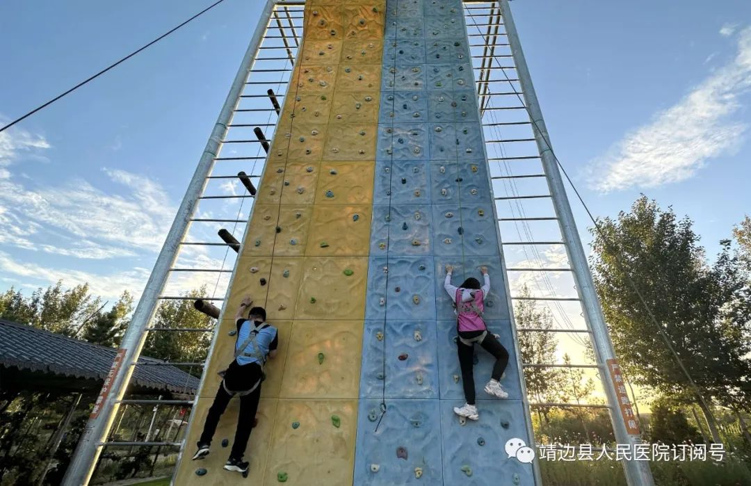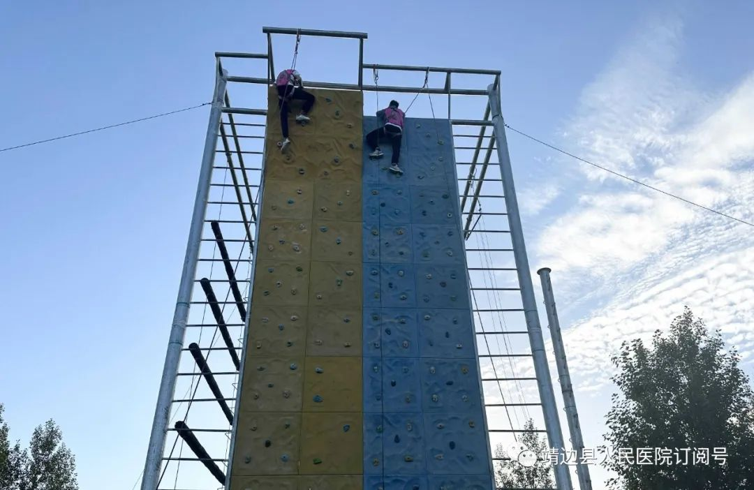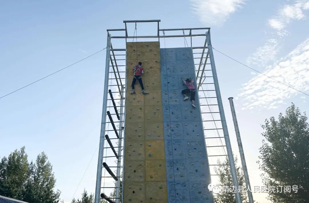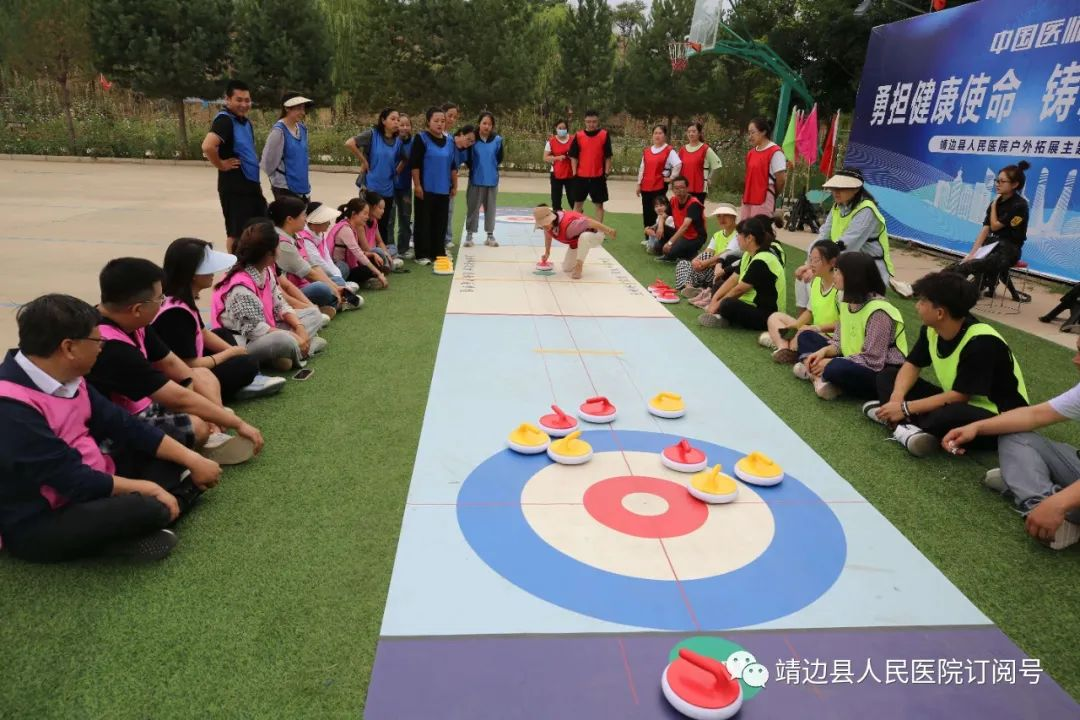 团体活动中,教练随机对参加人员进行分组,每组由不同科室的医务工作者组成,此次活动对拓展训练项目作了精心挑选,新增加了“毛毛虫、急速60秒、旱地冰壶、攀岩”等团体训练项目,很好地增强了成员间的凝聚力与团队协作能力。游戏过程中,大家充分发挥团队协作精神,互相沟通,认真完成每一项比赛项目。