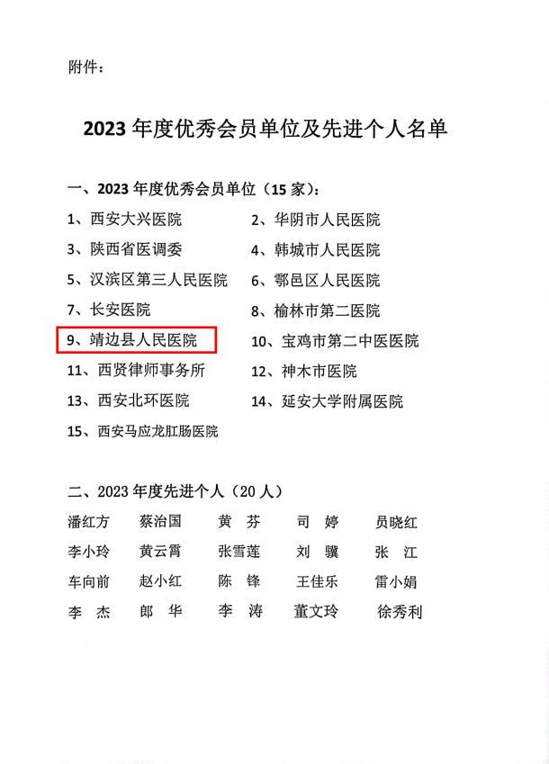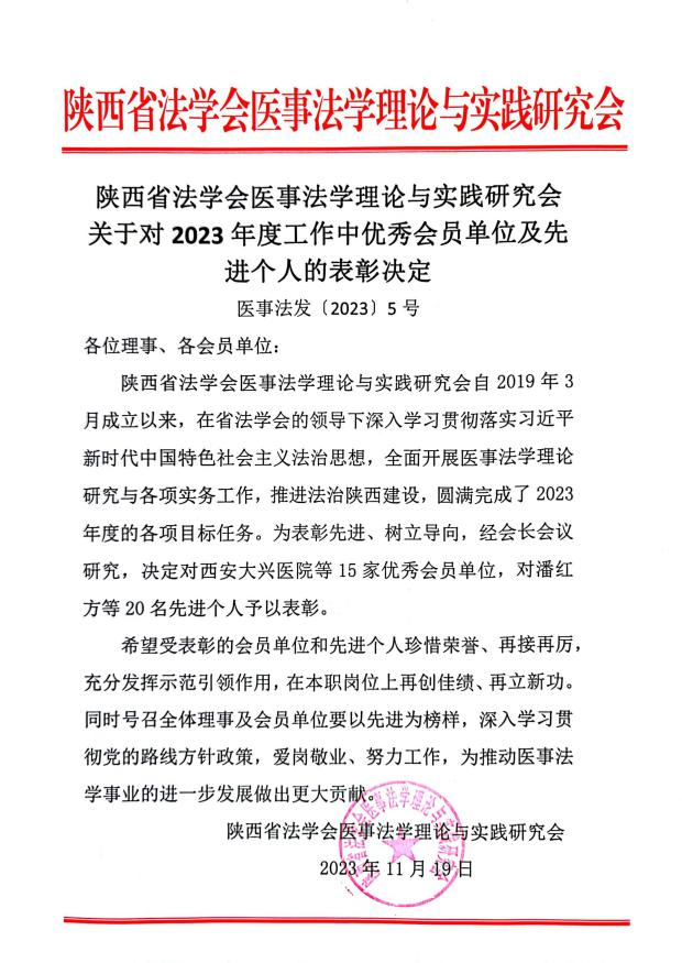 2023年11月19日,陕西省法学会医事法学理论与实践研究会2023年度工作总结表彰大会在西安召开。此次共有15家医疗卫生机构及法律单位被评为优秀会员单位,我院在2023年度依法执业、法制宣传工作中成绩突出,被评为“优秀会员单位”。