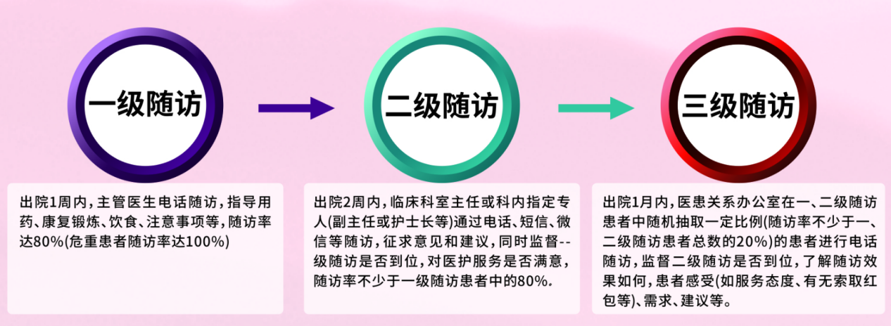 2016年7月,我院建立了出院病人三级随访制度,主动收集患者及陪人的意见和建议,随访方式包括电话随访、接受咨询、上门随诊等,了解病人出院后的治疗效果、病情变化和恢复情况,指导病人如何用药、如何康复、何时复诊,并对住院期间医护人员的服务态度、有无收受、索要“红包”等行风问题进行随访。制度运行至今,经过医院多次优化,目前运行效果良好,并将长期坚持实施。