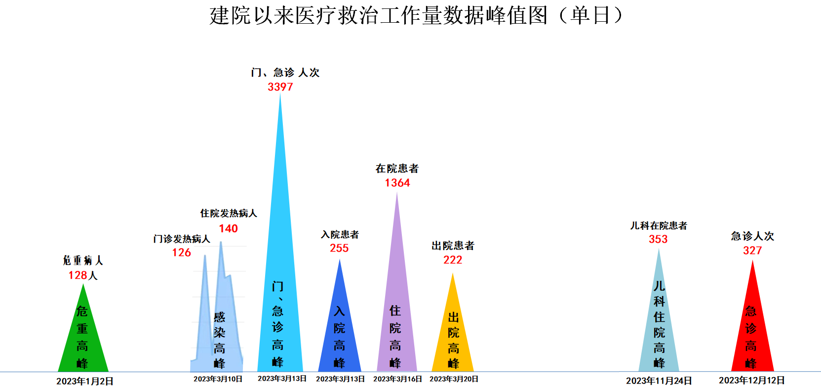 这一年,是我院建院以来承担医疗救治任务最多、最重的一年。经历了三次救治高峰,一年内连续14次超过医院医疗救治历史数据记录。2023年接诊门急诊77万多人次,同比增长21.58%;服务住院患者43003人次,同比增长29.96%;住院手术3847例,其中三四级手术2402例,占比62.44%。