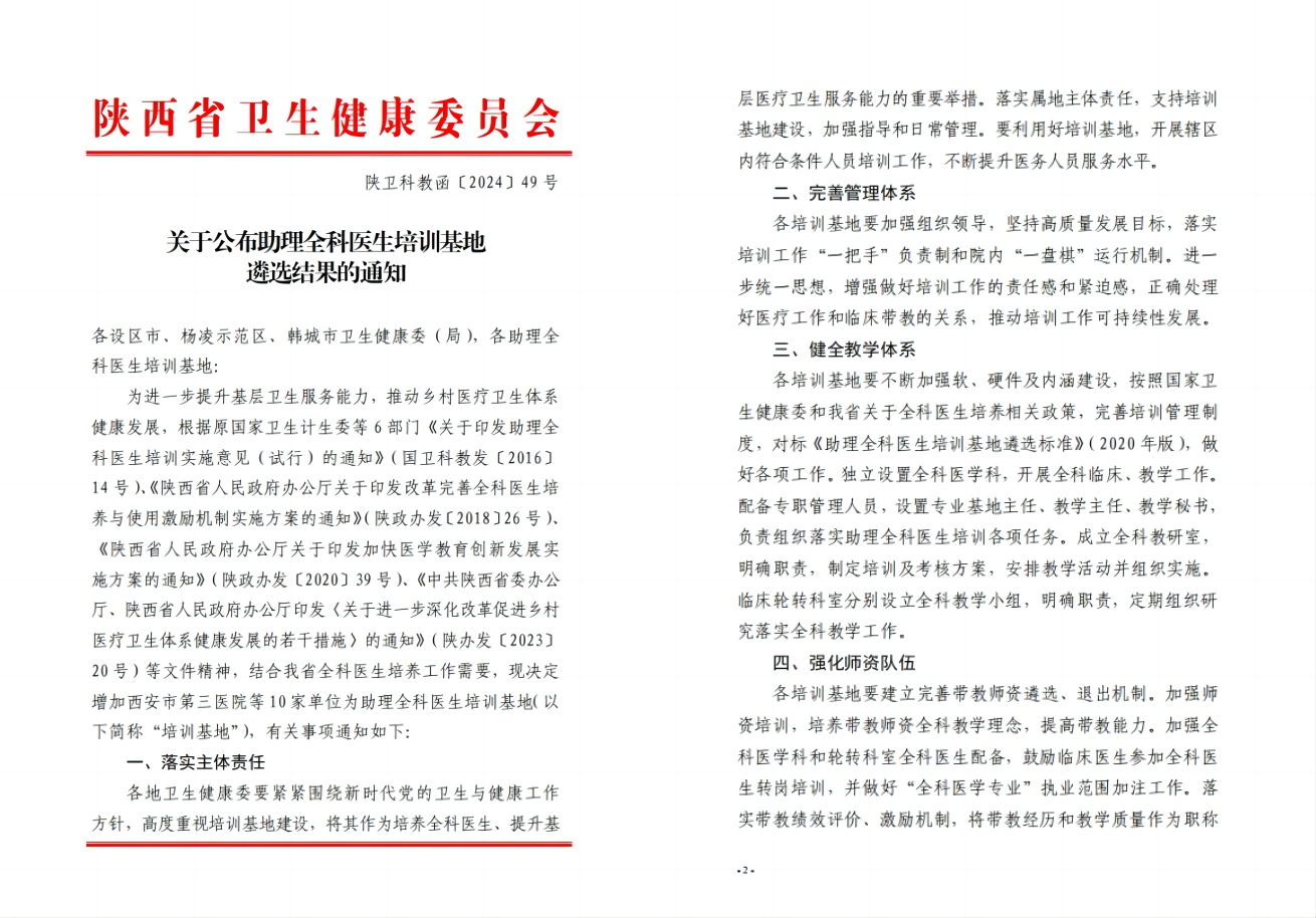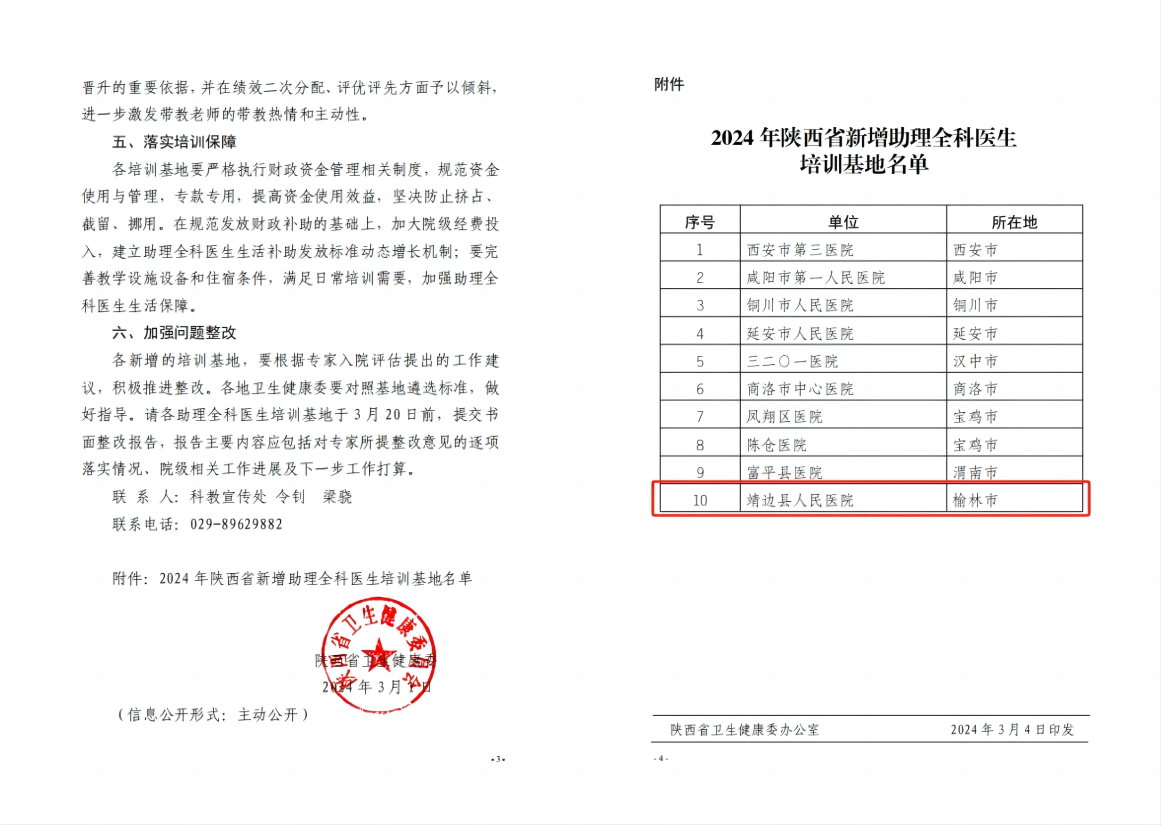 2024年3月,陕西省卫健委印发《关于公布助理全科医生培训基地遴选结果的通知》,靖边县人民医院成为榆林市唯一一家助理全科医生培训基地入选单位。该基地的建成,将为榆林乃至陕北地区基层医院医务人员提供良好的学习培训平台,进一步推进基层卫生人才队伍建设,提升基层卫生技术人员的业务能力和技术水平,极大地促进区域基层卫生体系的建设与发展。