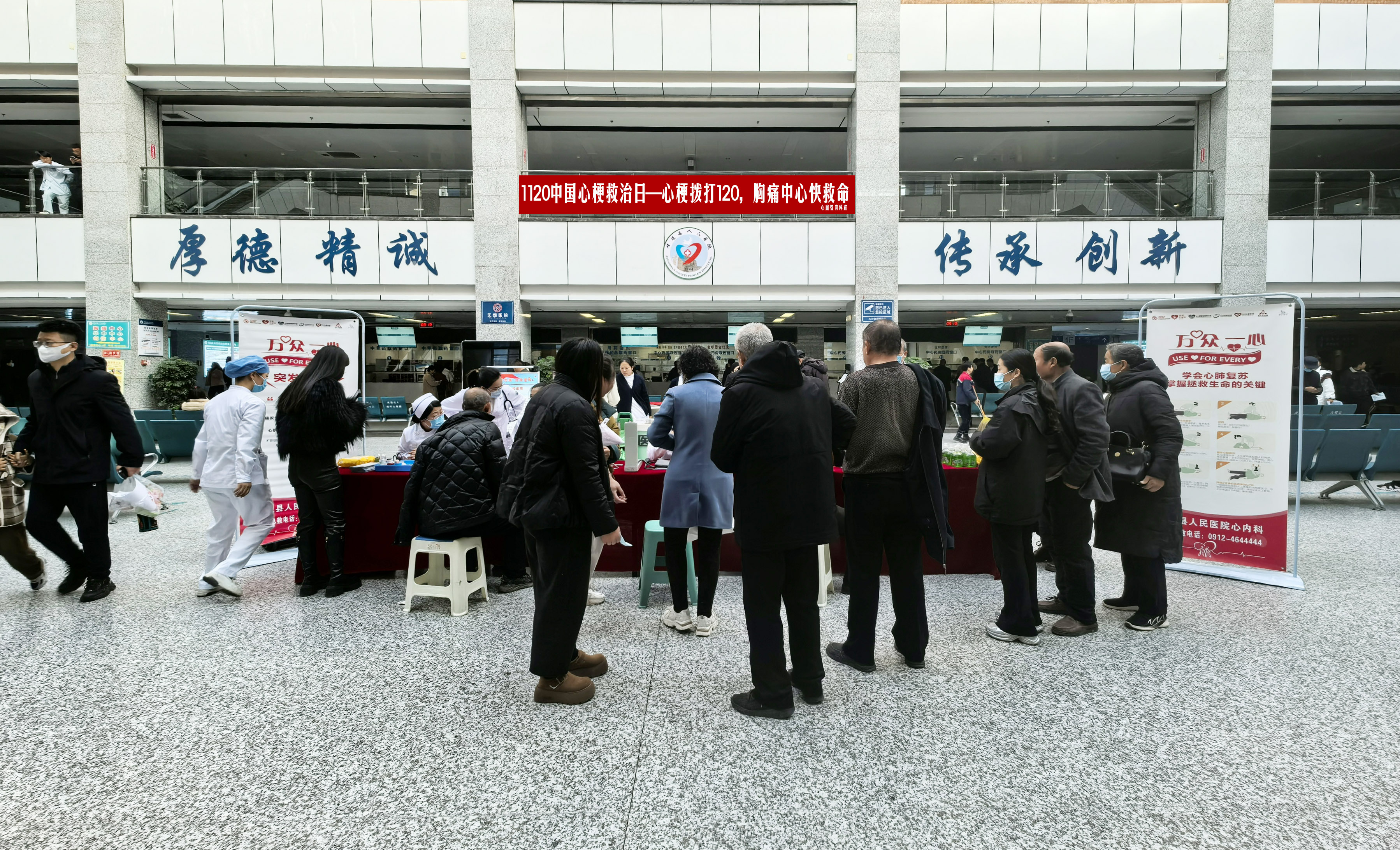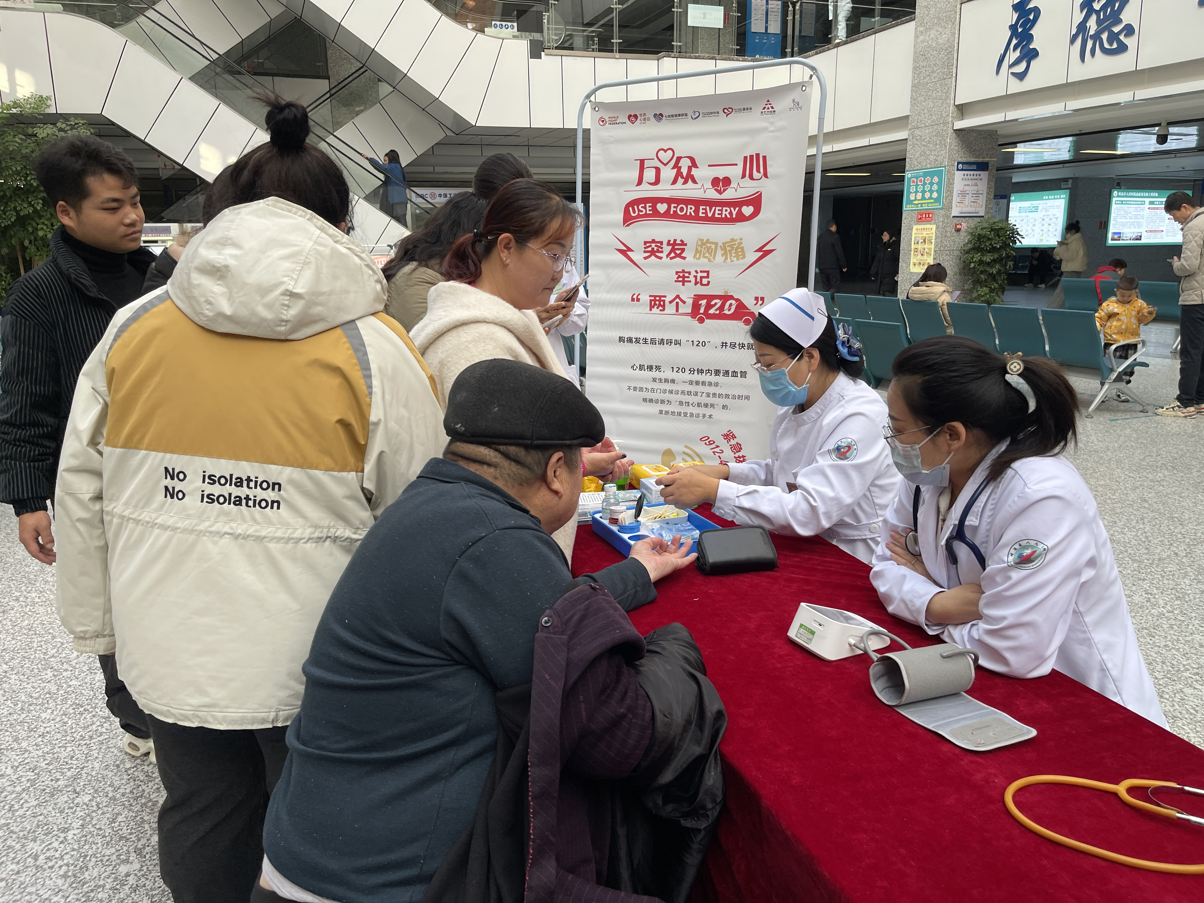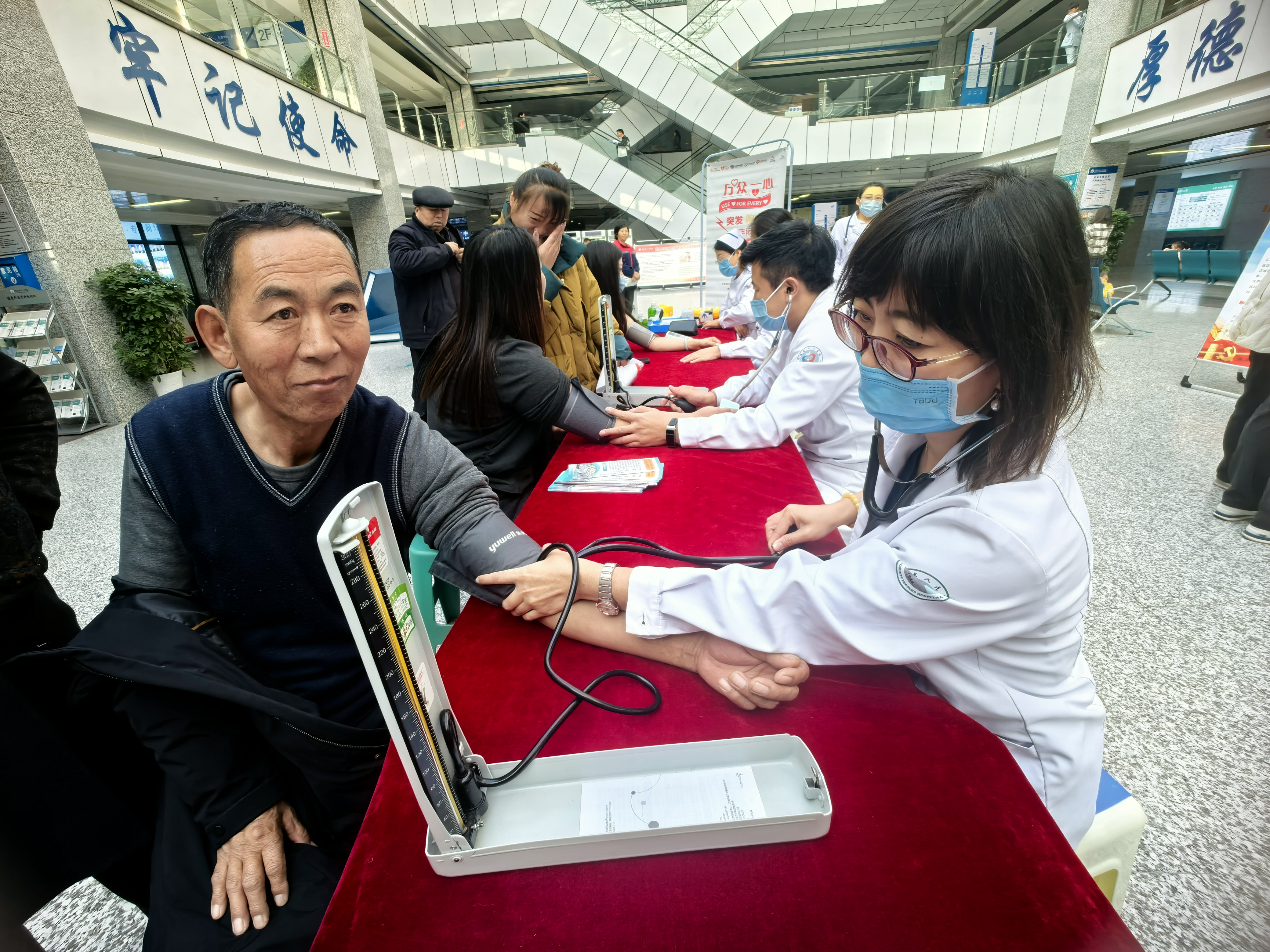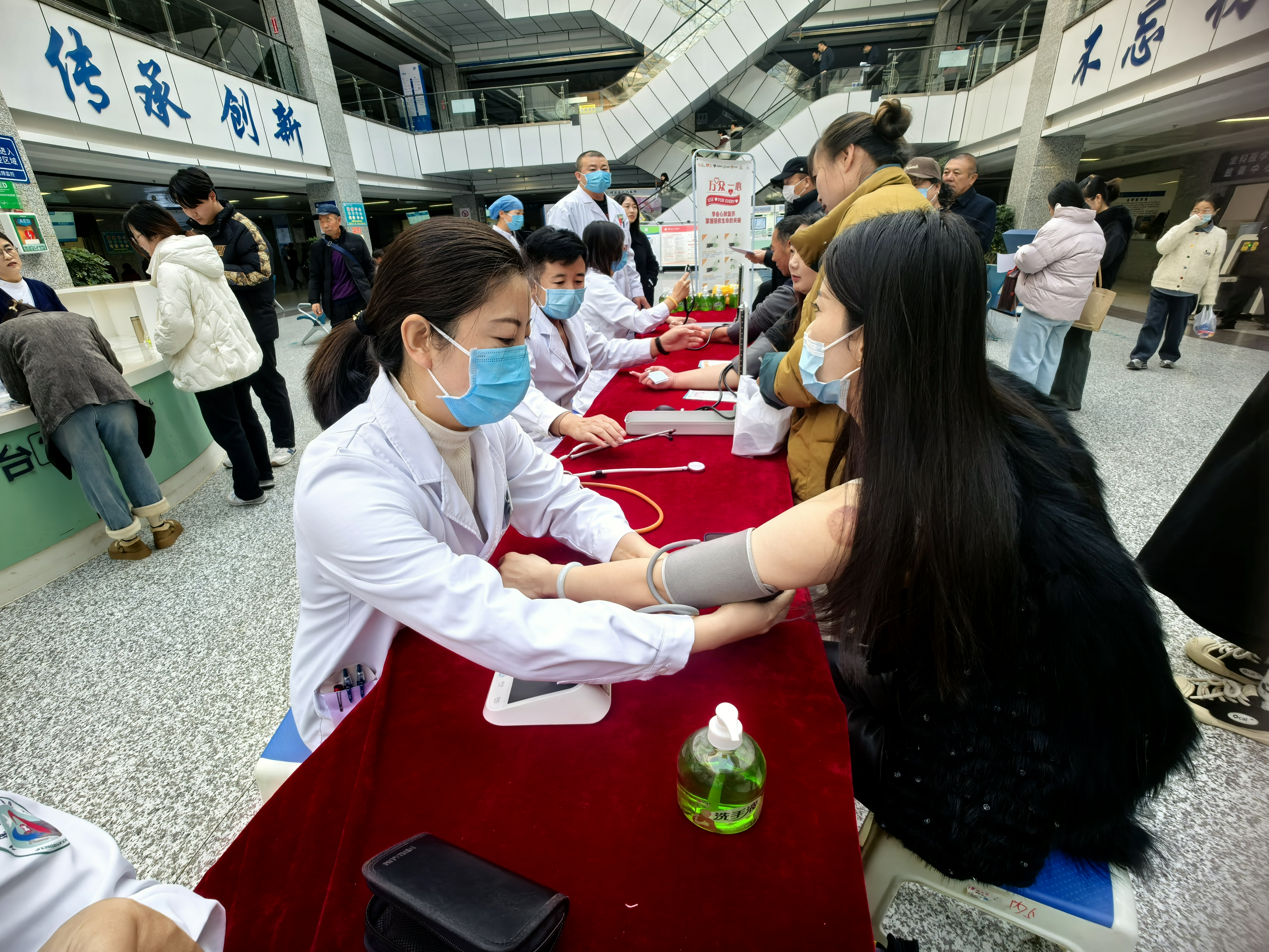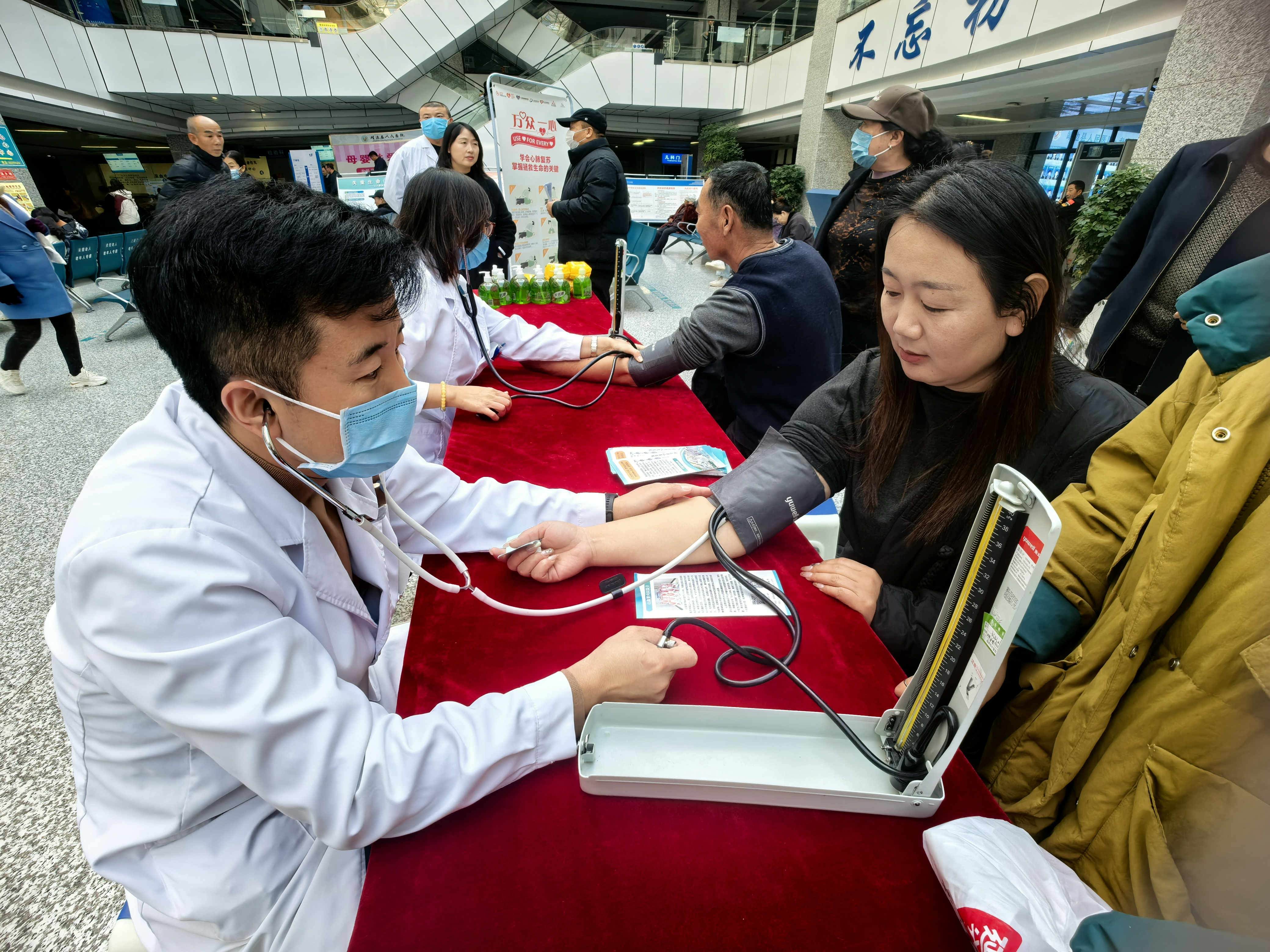在医院门诊大厅,心血管内科医务人员为就诊群众免费测量血压、血糖,提供健康咨询,并对心血管疾病进行诊断,暖心提供可行医疗方案,给予合理建议。