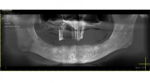 王某,男,62岁。早年因牙周疾病导致下颌牙齿全部缺失,下颌骨逐渐吸收低平,之前佩戴的活动假牙容易松动、脱落,严重影响了正常进食,让他饱受困扰,遂来到我院口腔中心就诊。我院口腔中心主任白治东在对患者进行全面的口腔检查、影像学评估以及身体状况综合分析后,为患者制定了导板引导下的种植修复治疗方案。