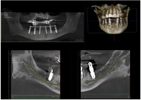 手术当日,患者在双侧下颌神经阻滞麻醉+局部浸润麻醉后,将导板佩戴到患者口腔,沿着预先设计好的导板路径,快速而精准地植入了6颗种植体,之后安装复合基台、转移帽制取模型;手术过程顺利,术时明显缩短,术中出血量极少,术后反应轻微。种植4小时后,患者完成过渡义齿佩戴。实现了早上手术,下午进食,患者非常满意。