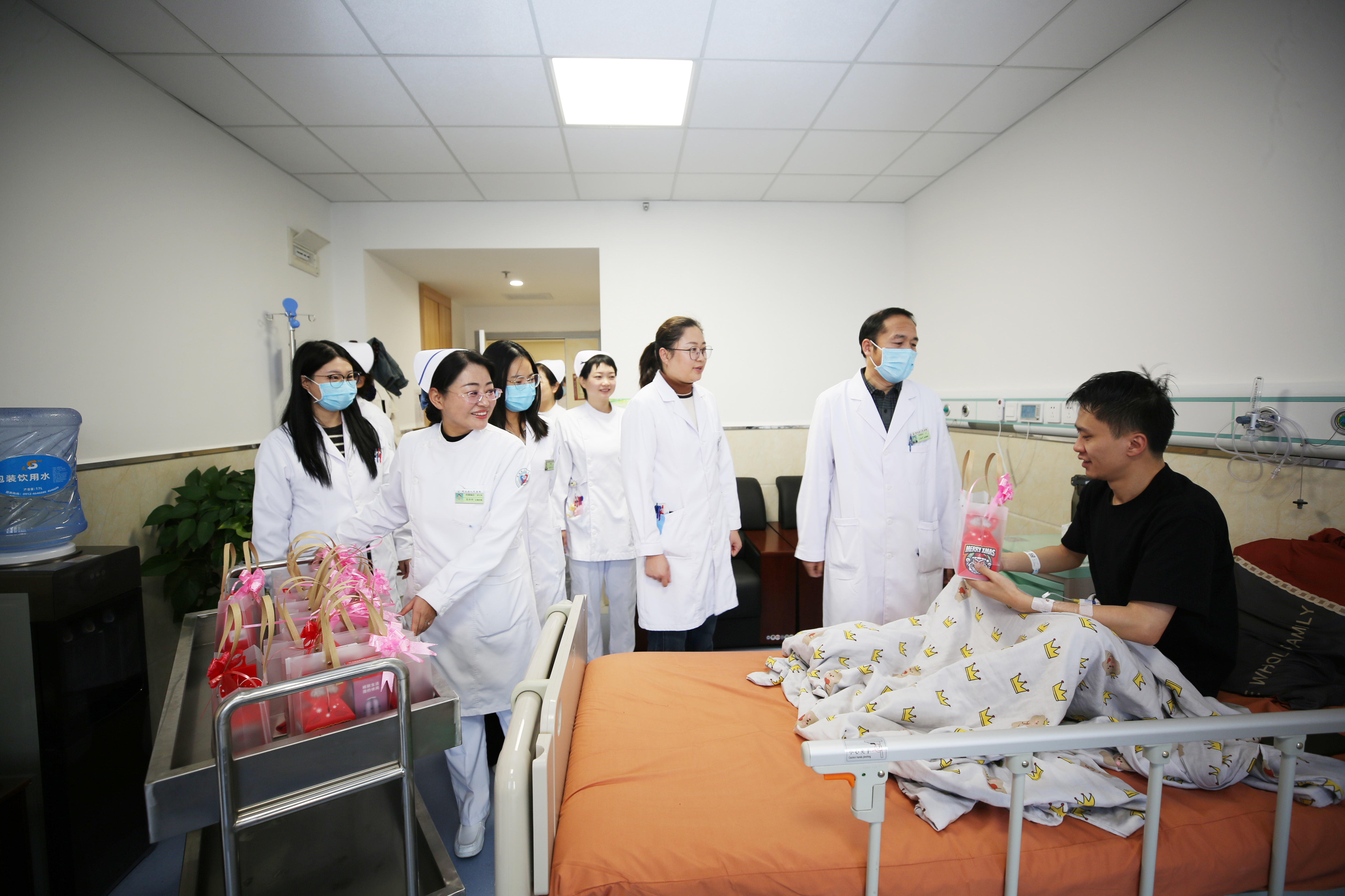 晨交班结束后,医护人员分组前往各个病房一一派送节日礼物,传递温情。每到一处,医护人员都为患者送去温暖的问候和祝福:“预祝他们新年快乐,早日康复!”一束束鲜花、一个个保温杯、一双双保暖袜,递到患者手中,也将关爱与温暖送进了他们的心田。患者们脸上洋溢着惊喜与感动,殷切的与医护人员互动交流。