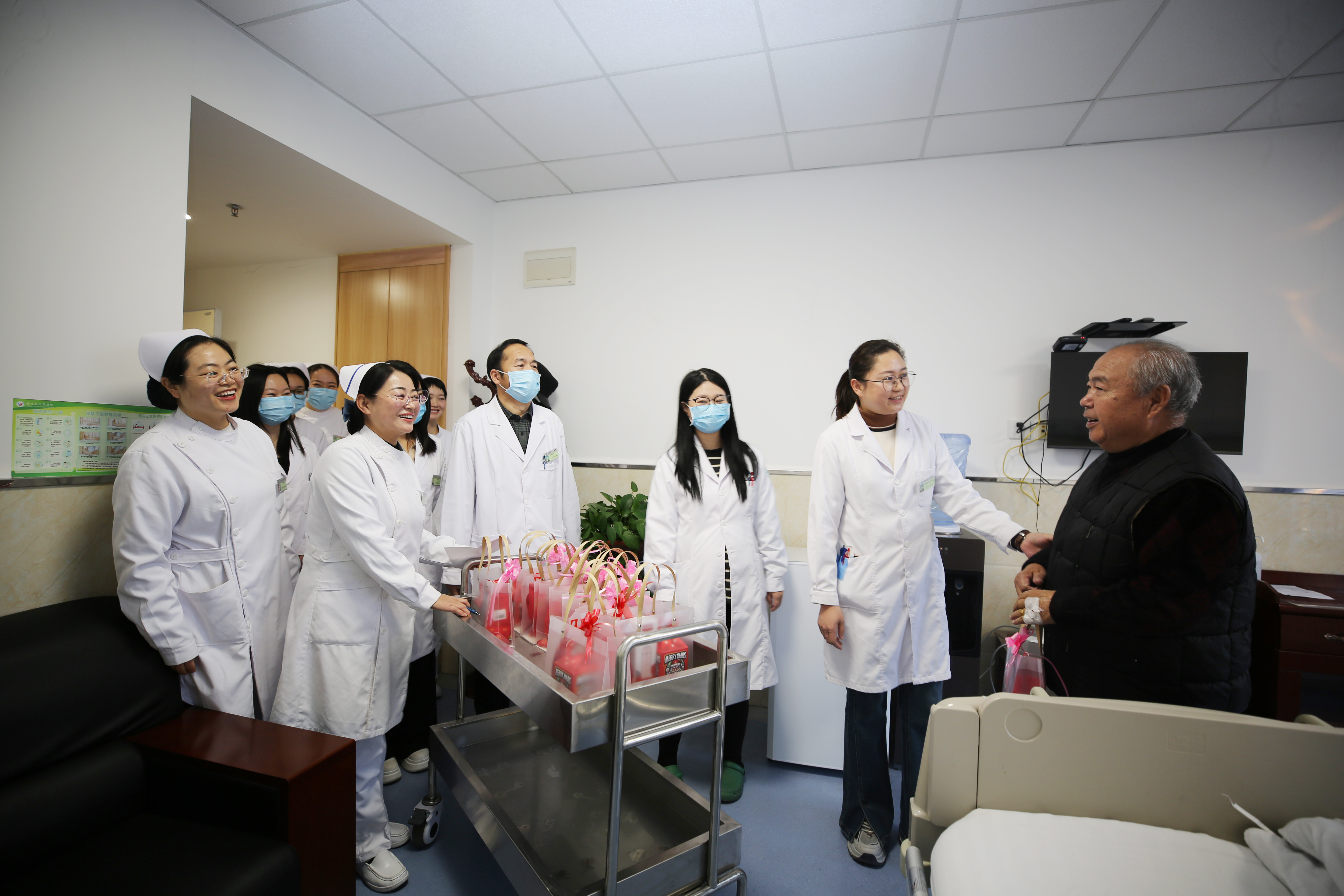 在新年来临之际,为了让住院患者感受到节日的温暖与医护的关怀,我院特需病区全体医护人员组织了一场送温暖活动,向患者传递了新年的美好祝福。