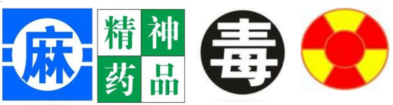 (2)特殊管理药品标识:分别是“麻”字(蓝白相间)(麻醉药品)、“精”字(绿白相间)(精神药品)、“毒”字(黑底白字)(医疗用毒性药品)和“放”(红黄相间)(放射性药品)。