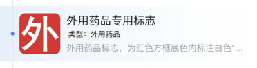 (3)外用药品标识:药品包装醒目位置标出的“外”字(红底白字),表示该药物只能外用。