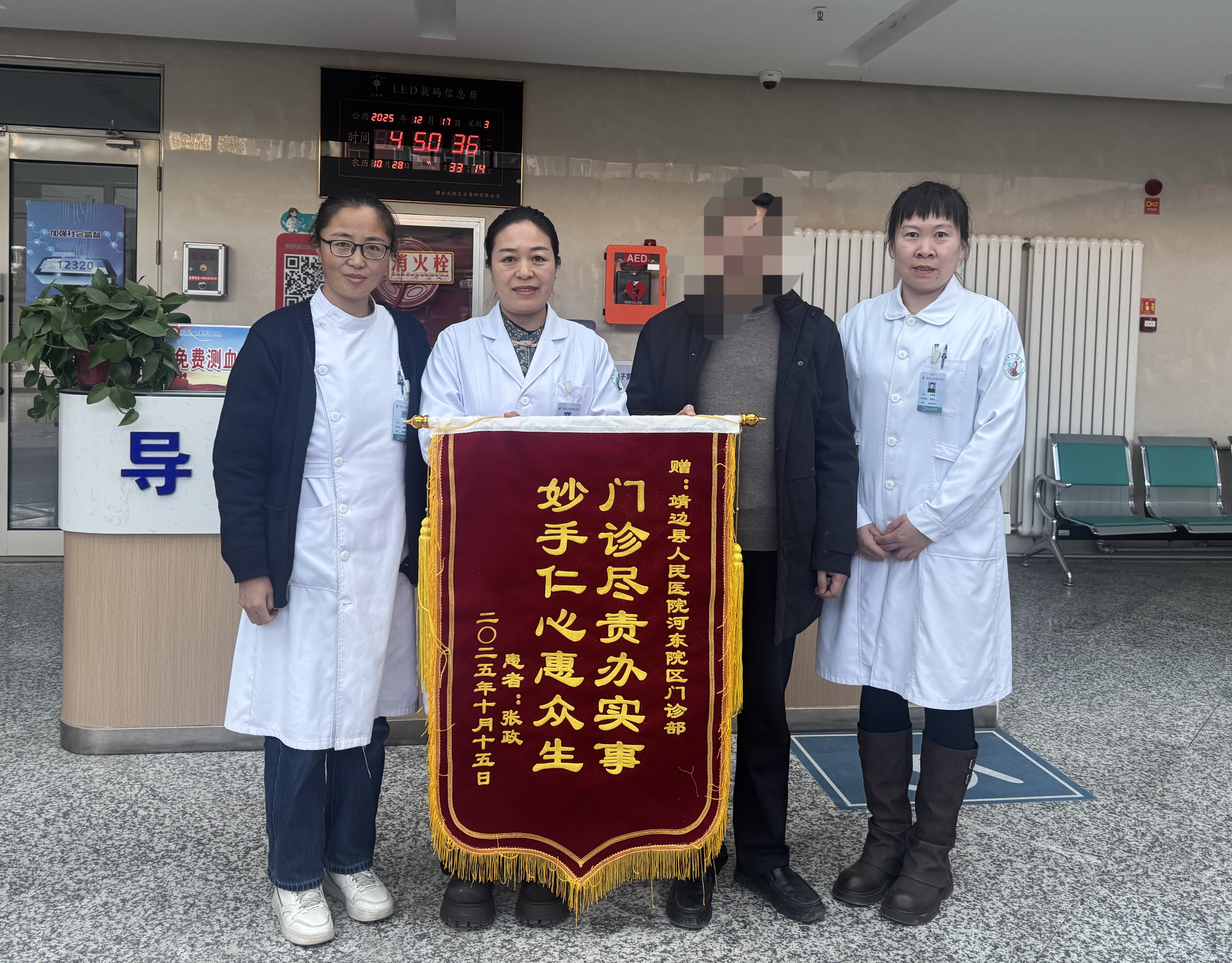 我院河东院区门诊部,温暖的医患故事时长发生。近日,一位市民与同事前来办理业务,因证件不全且人员较多,十分焦急。门诊部负责人刘俊花同志主动上前询问,耐心沟通协调,最终顺利为十余人办妥手续。面对事后的诚挚谢意,她只是微笑回应:“这都是我应该做的。”2025年12月17日,该市民代表全部人员专程送来锦旗,感谢这份设身处地的帮助。
