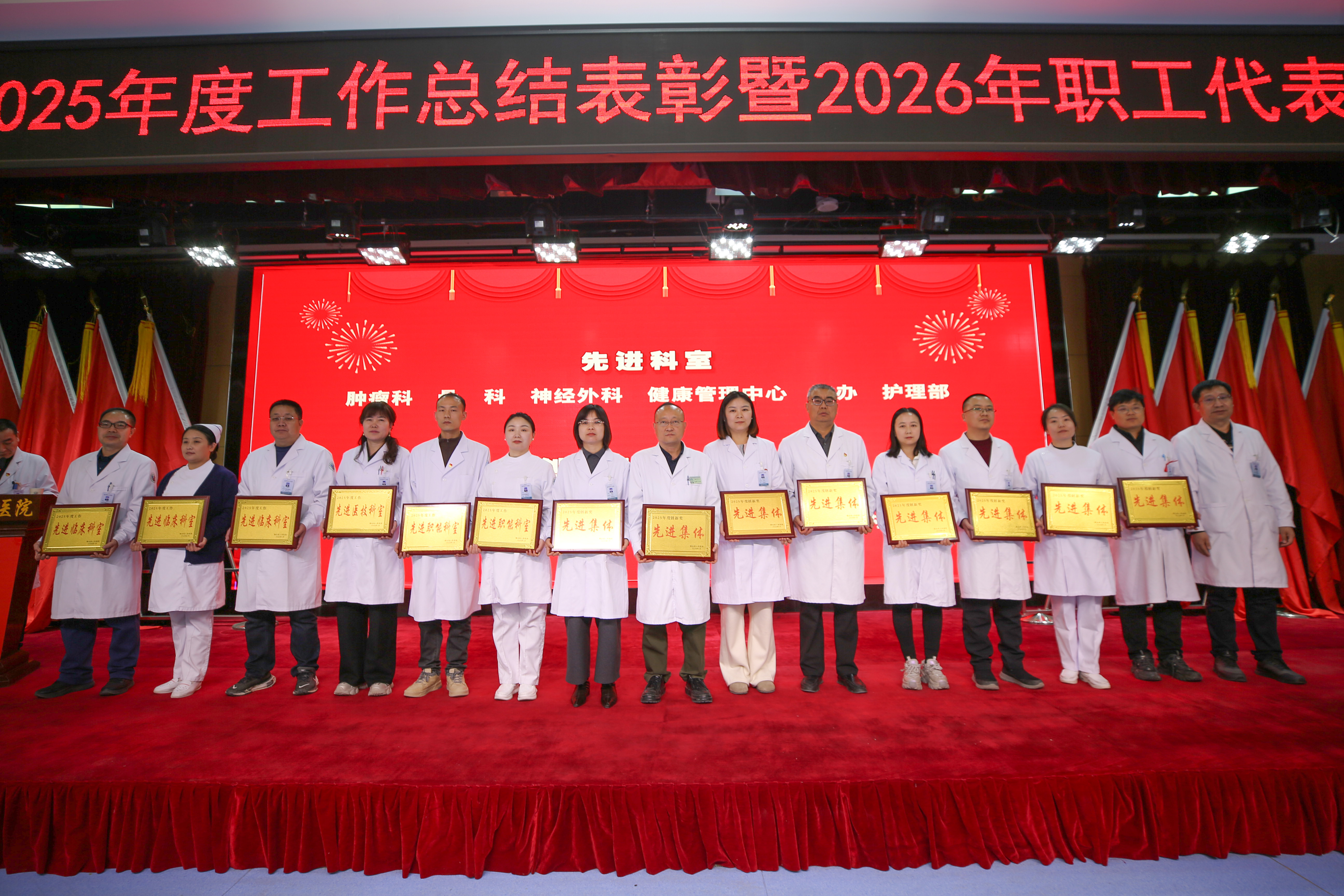 2026年1月16日,我院隆重召开2025年度工作总结表彰大会暨2026年第一次职工代表及党员代表大会。会议旨在全面总结过去一年工作,表彰先进典型,共商新一年发展大计。医院党政班子全体成员、中层管理干部、部分乡镇卫生院院长、受表彰的先进工作者及职工代表、党员代表齐聚一堂。会议由党委书记袁海军主持。