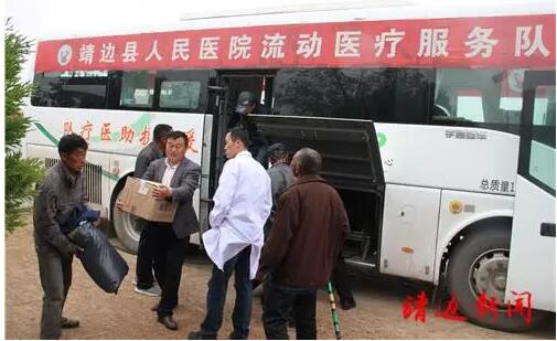 图为:靖边县人民医院流动医疗服务队利用流动医疗服务车免费为高升村65岁以上老年人,进行拍胸片、做心电图、B超、肝肾功等检查
