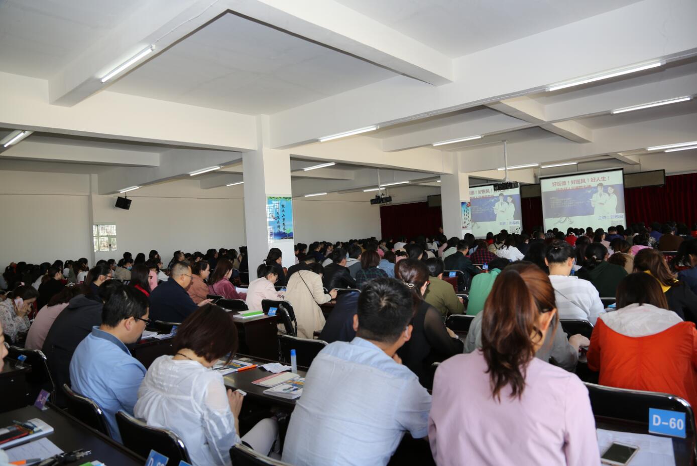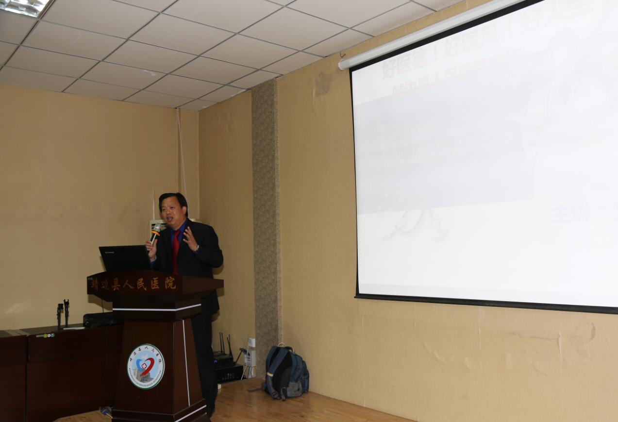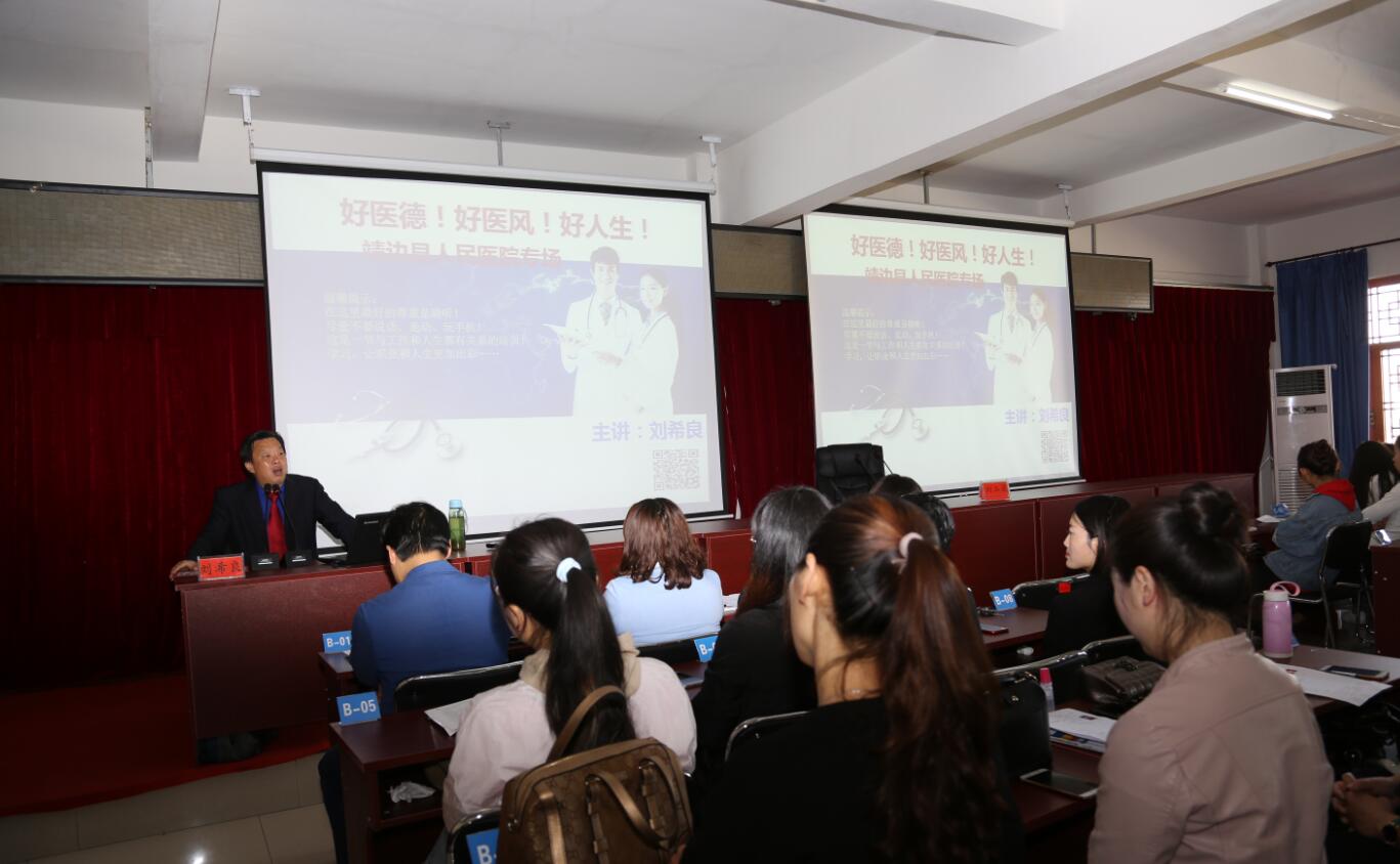 图为:刘希良教授在我县兴国职业技术学校三楼会议室为我院医务人员做《好医德 好医风 好人生》专题讲座