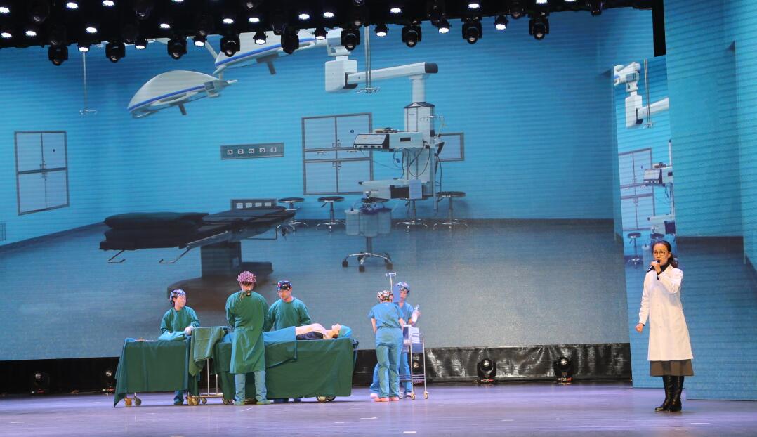 我院代表队第四个出场, “你从浩瀚的天地间走来,秉承着太阳和月亮的风骨,在血与火的洗礼中,播撒着生命的阳光和雨露;你从遥远的古人类战场上走来,身披着抗争病魔的沥血战袍,在生与死的较量中,洋溢着起死回生的骄傲;你从神秘的医学圣殿里走来,肩负着救死扶伤的圣神使命,在苦与累的历练中,书写着妙手回春的光荣;你从璀璨的现代文明中走来,手捧着健康生活的缤纷彩虹,在仁与爱的交融中,綻放着温馨而灿烂的笑容.......”一段段优美动听的吟诵声穿透整个礼堂,4名医务工作者饱含深情的朗诵着, 40年前落后的医疗水平和现代精湛手术的情景对比,使比赛进入高潮, 21名医务工作者们,以铿锵有力、饱含深情、极富感染力的表演,打动了现场所有的观众,从众多代表队中脱颖而出,赢得评委和在场观众的高度赞扬,荣获一等奖。