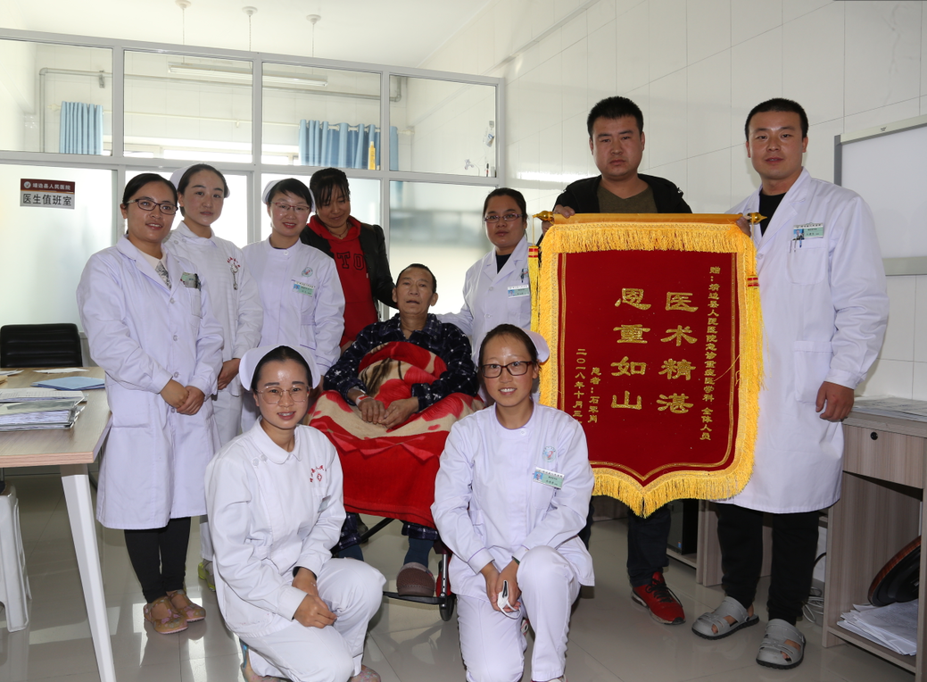 随后,患者在我院重症医学科接受了一个多月的精心治疗,病情逐渐好转,并从重症医学科转入综合内科进行康复治疗,同时家人也为重症医学科的医护人员送来锦旗及感谢信表示感谢。在送感谢信时,石军霄的哥哥说:“真的感谢你们县医院的医护人员,给了我弟弟第二次生命!”