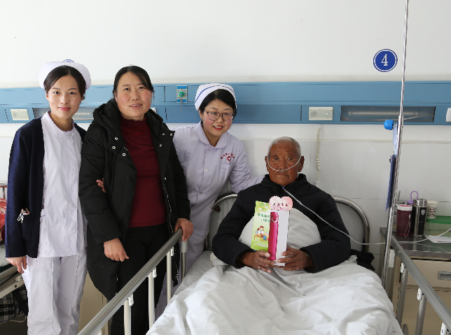 座谈会结束,医护人员拿着她们用心为病人准备的新年礼物,一个精美、暖心的保温杯,并附有一张写有“祝您早日康复”的粉色桃心卡片,和几页常见疾病预防知识宣传单,到每个病房去为患者赠送。接到水杯的那一刻,患者及家属的脸上充满了感动和感谢,一句真诚的“祝您早日康复”,更是将患者与医护人员的心拉近了。