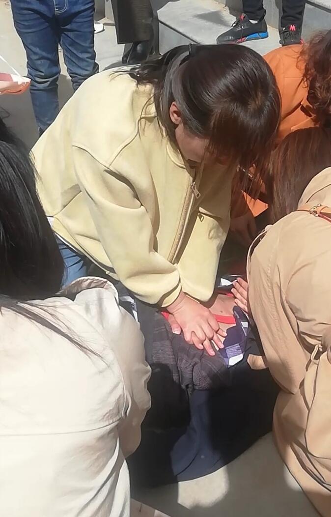 乔秀秀看老人嘴唇发青,向家属询问老人病情,家属说:老人在走的时候突然晕倒了,你会抢救吗?乔秀秀说我是靖边县人民医院重症医学科的护士,患者家属央求道:“求求你!救救我爷爷。”乔秀秀立即进行了现场救治,结合自己的临床经验,她让周围的人把老人放平,给老人把脉,脉搏已经消失,胸廓也没有起伏,判断心跳、呼吸停止,把老人头向后仰,解开衣领和裤腰带,开始心肺复苏并让家属配合进行人工呼吸。