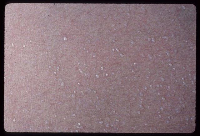 3. 深痱(深部粟粒疹) 这是很少见的类型,发生于严重、反复的红痱后。皮疹发生在真皮层,出汗刺激后明显增大,刺破后有明显的浆液流出。严重时会出现疲劳、食欲不振、头痛眩晕等热衰竭全身症状。