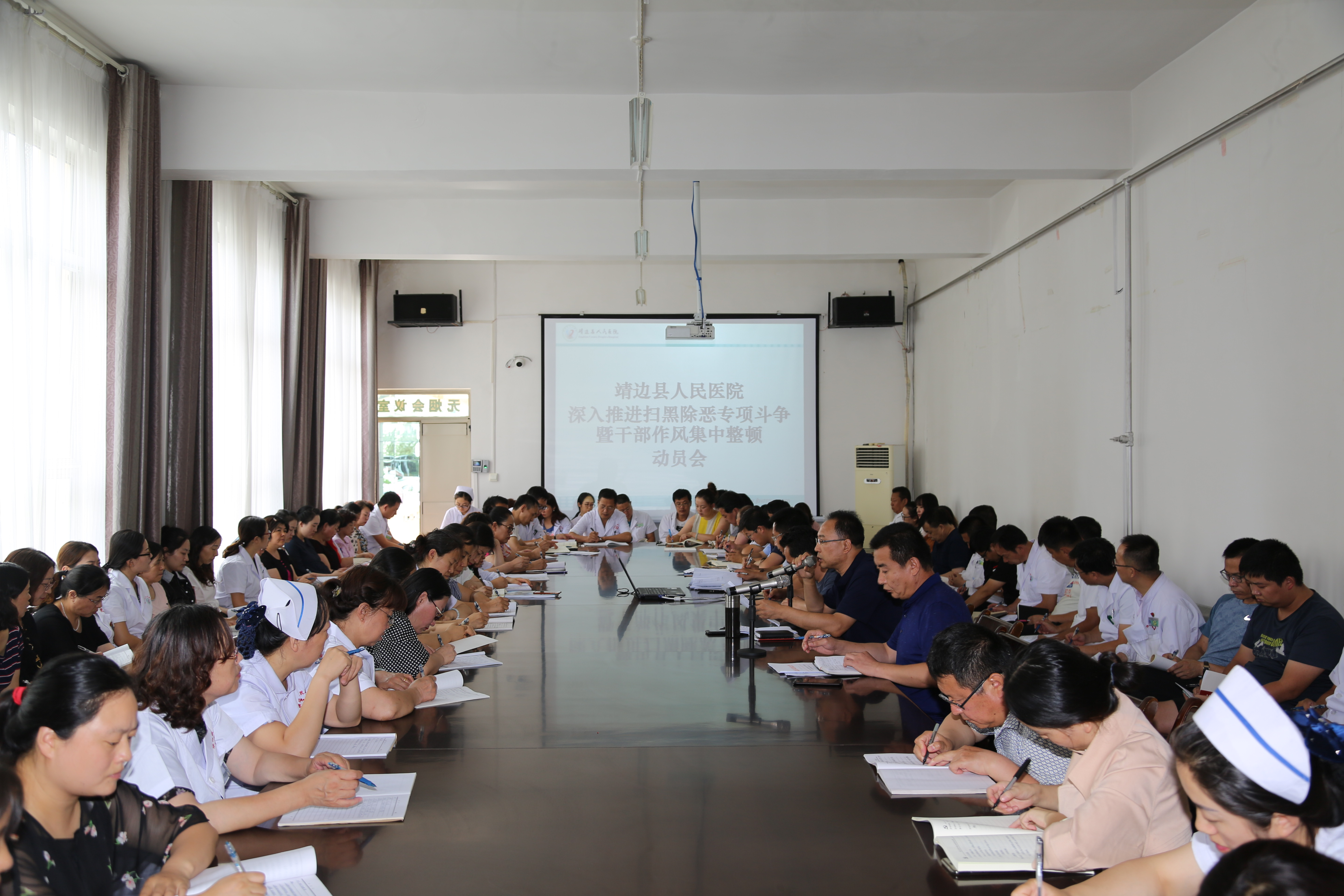 为深入推进扫黑除恶和干部作风建设,锲而不舍落实中央八项规定精神,坚决防止“四风”问题反弹回潮,努力营造风清气正的干事创业环境,着力转变工作作风、提升工作效率,营造良好的工作氛围,推动医院各项工作平稳健康发展。2019年8月3日下午,靖边县人民医院在德业楼二楼会议室召开深入推进扫黑除恶专项斗争暨干部作风集中整顿动员大会。中层及以上干部、全体党员参加会议,会议由院长马枭今主持。