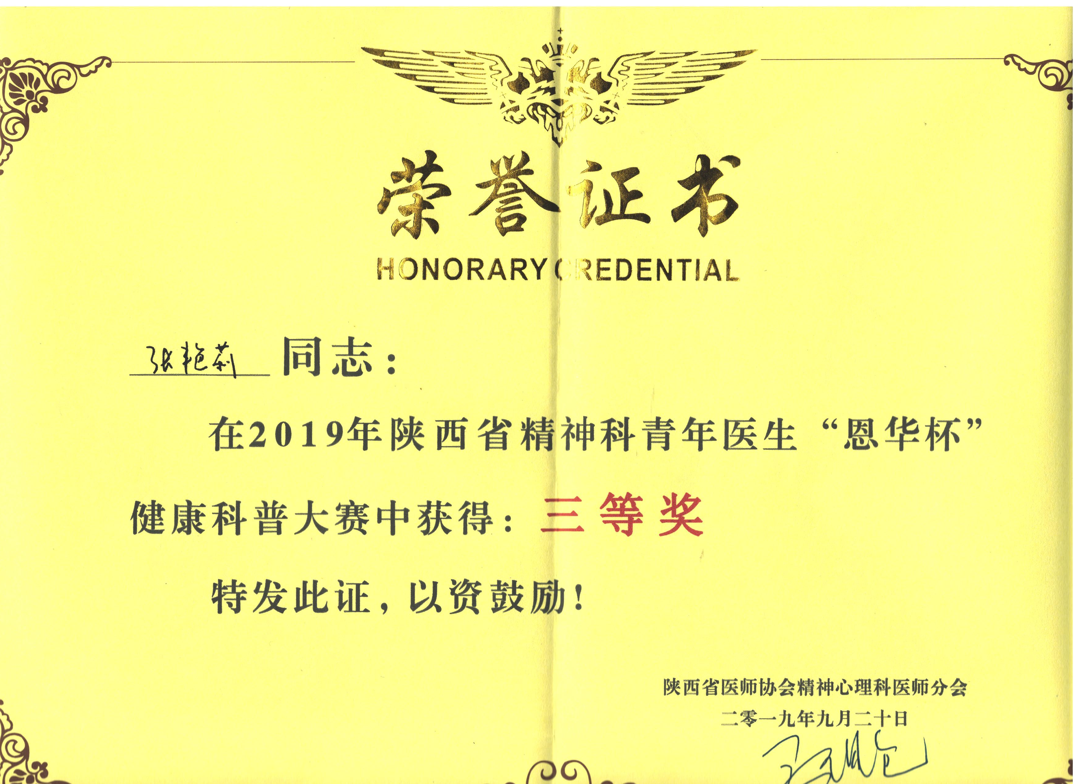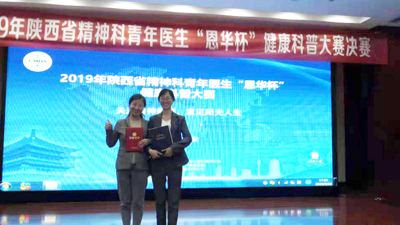 2019年陕西省精神科青年医生“恩华杯”健康科普大赛在西安举办。本次大赛由陕西省医师协会精神心理科医师分会、西安市交通大学第一附属医院主办。主题为“关注精神健康,重见阳光人生”。西安交通大学第一附属医院马现仓院长,陈云春教授、陈策教授,西京医院王怀海教授、西安市精神卫生中心戴尊孝教授、张辉教授为此次大赛评委。