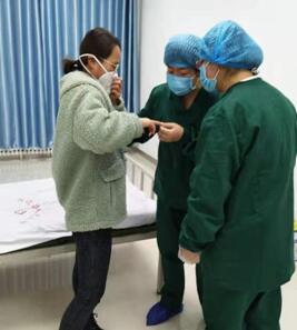 在治疗过程中,一位护师给患者采血不小心划破了自己的手指,到医生办公室王彩荣主任为受伤护师查看伤情并消毒,还给她了一个深深的拥抱。
