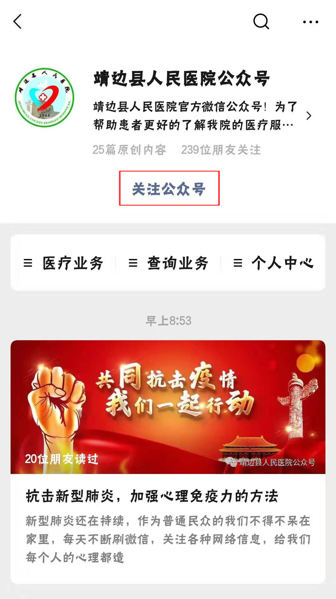 有需求的群众可以在家通过『靖边县人民医院公众号』进行了解。