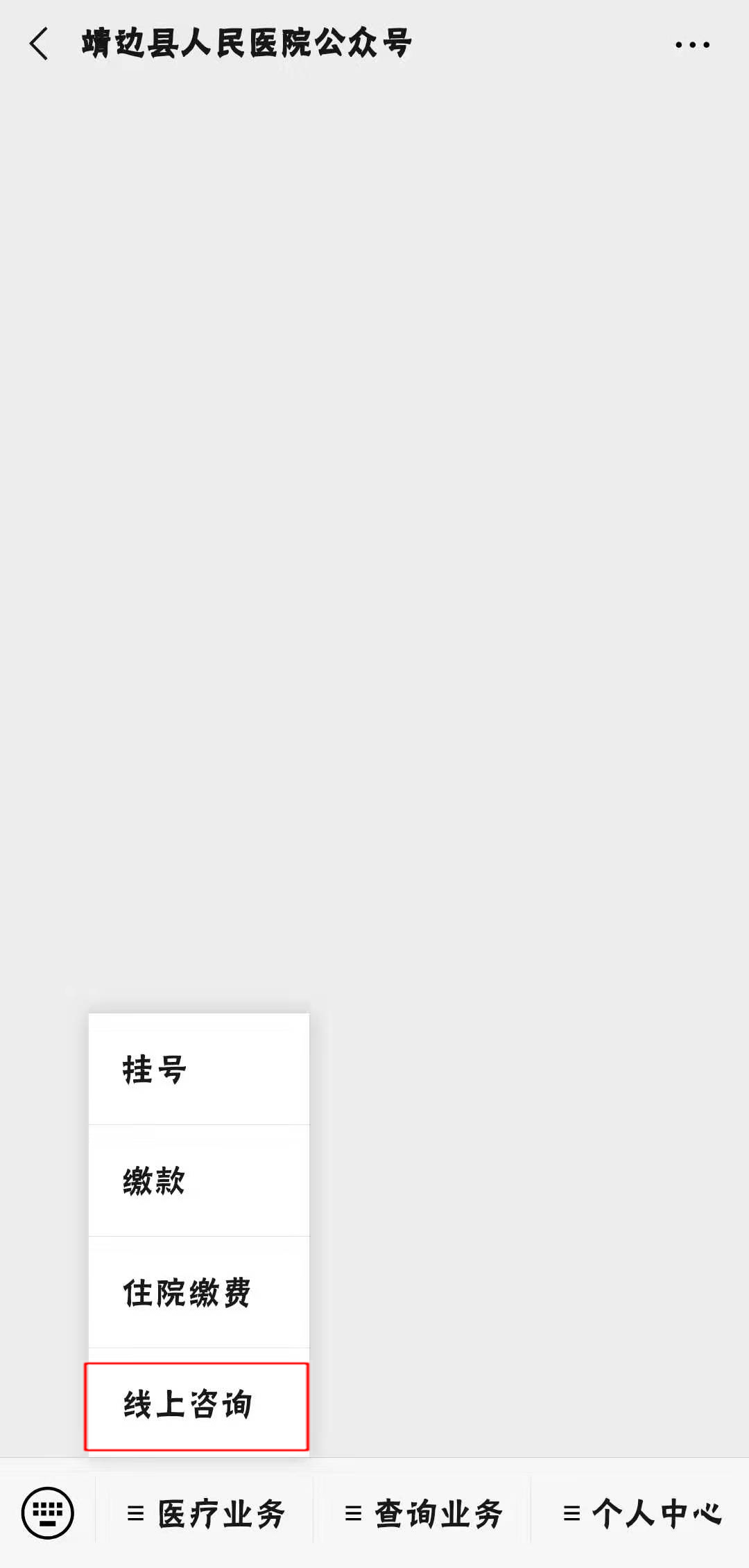 关注【靖边县人民医院公众号】,选择【医疗业务】中的【线上咨询】菜单