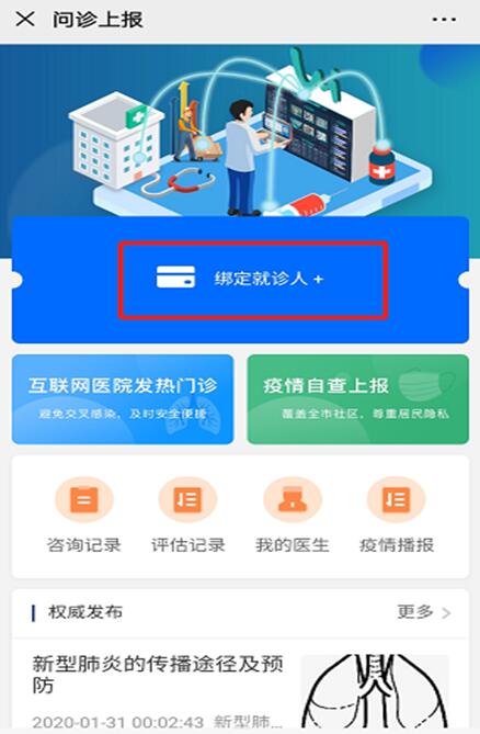 选择“绑定就诊人”,认证方式选择“手机号”进行绑定,绑定成功自动返回疫情在线咨询主页面,并可查看到绑定人。