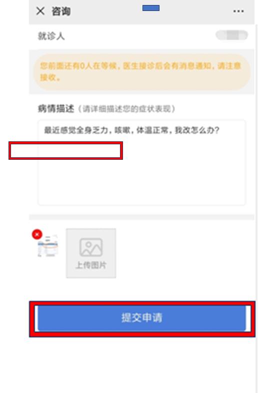 咨询时请您尽量在“病情描述”中描述自己想问诊的问题,必要时可拍照或上传手机中的相关图片,描述清楚后提交申请,随后等待医生回复即可。