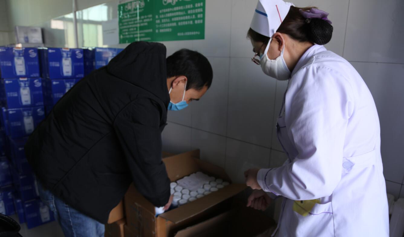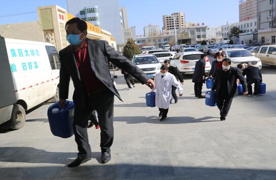 图为:榆林茂东医疗器械有限公司为我院捐赠84泡腾片,党政办组织为一线工作人员发放